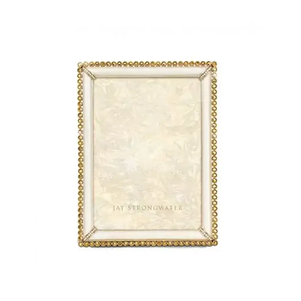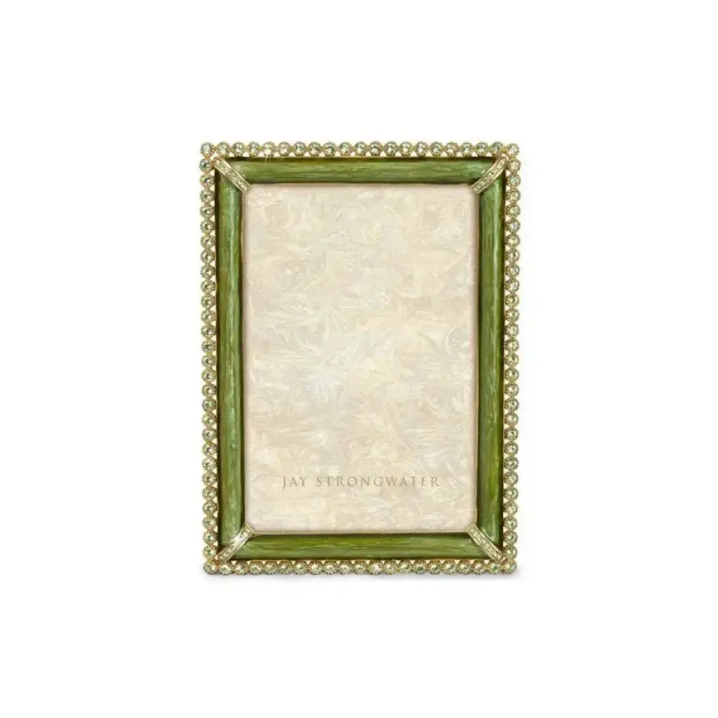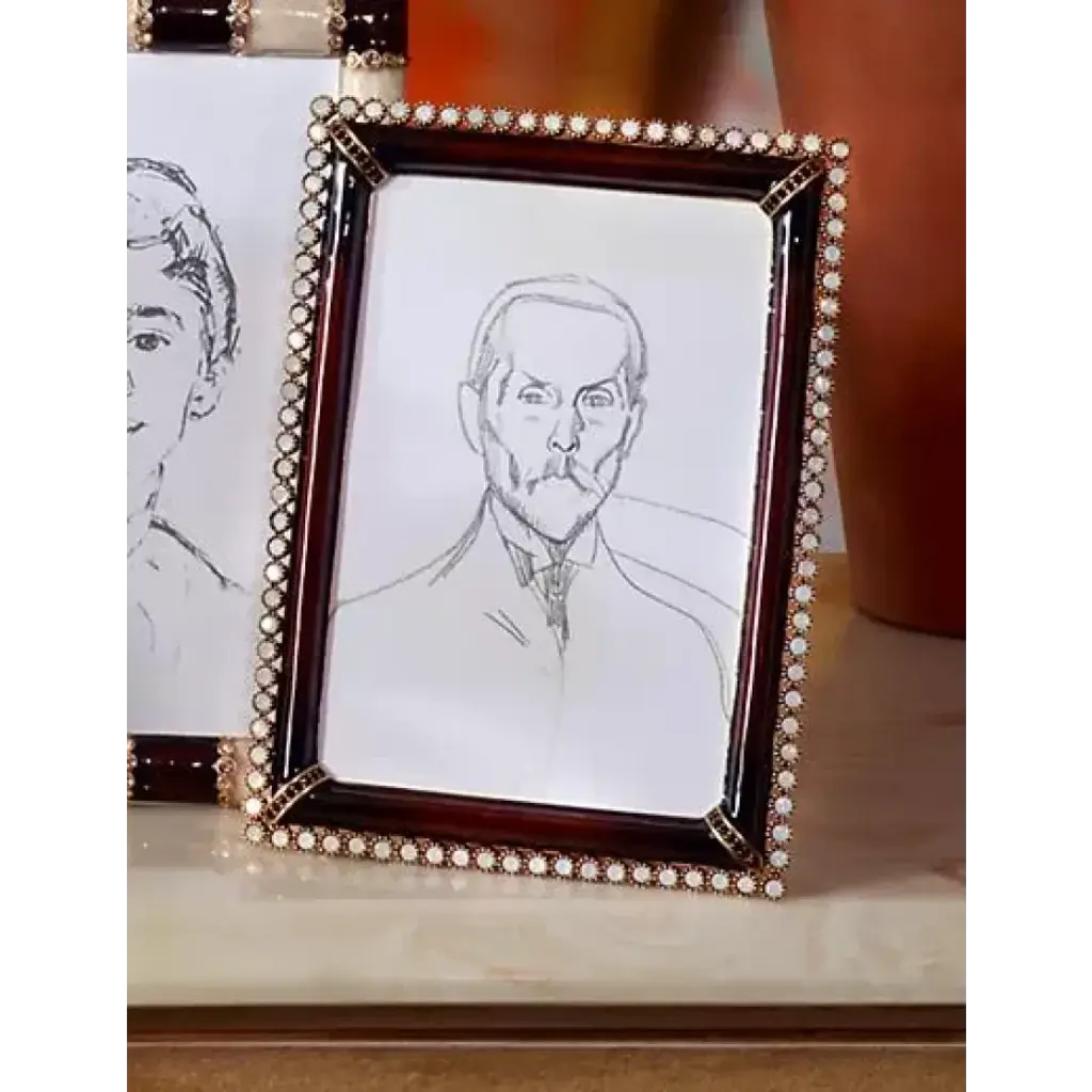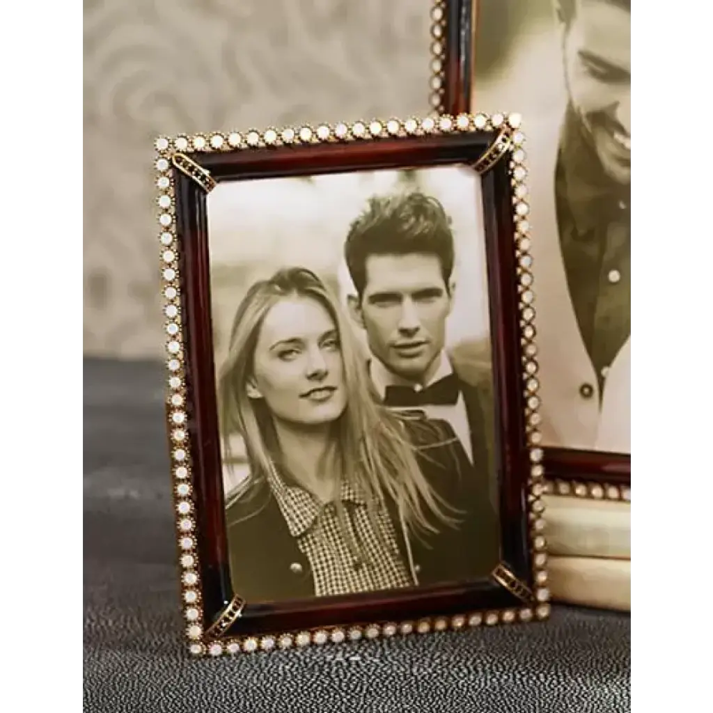 The elegant, dark brown Lorraine Stone Edge 4" x 6" Frame is outlined with white opal crystals for great graphic appeal. A chic complement to the bold Safari Collection.