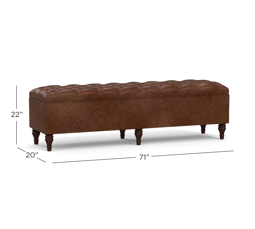 Evoking the glamour of Hollywood Regency style, our Lorraine Tufted Leather King Storage Bench has plush cushioning and deep tufting. Use it in a living room as additional seating or in a bedroom as you prepare for the day or evening ahead. Open the top to discover a convenient place to store books, games or throws.