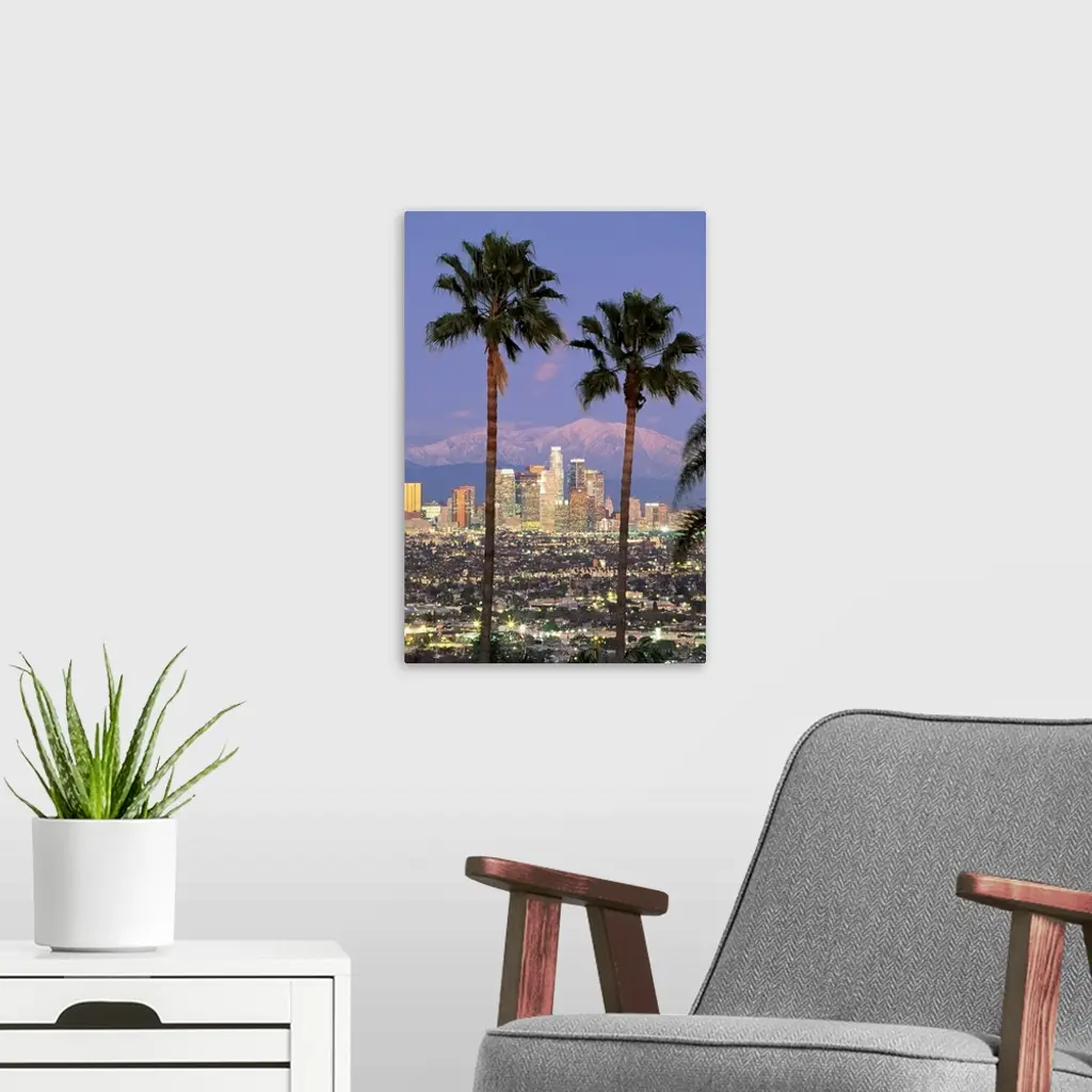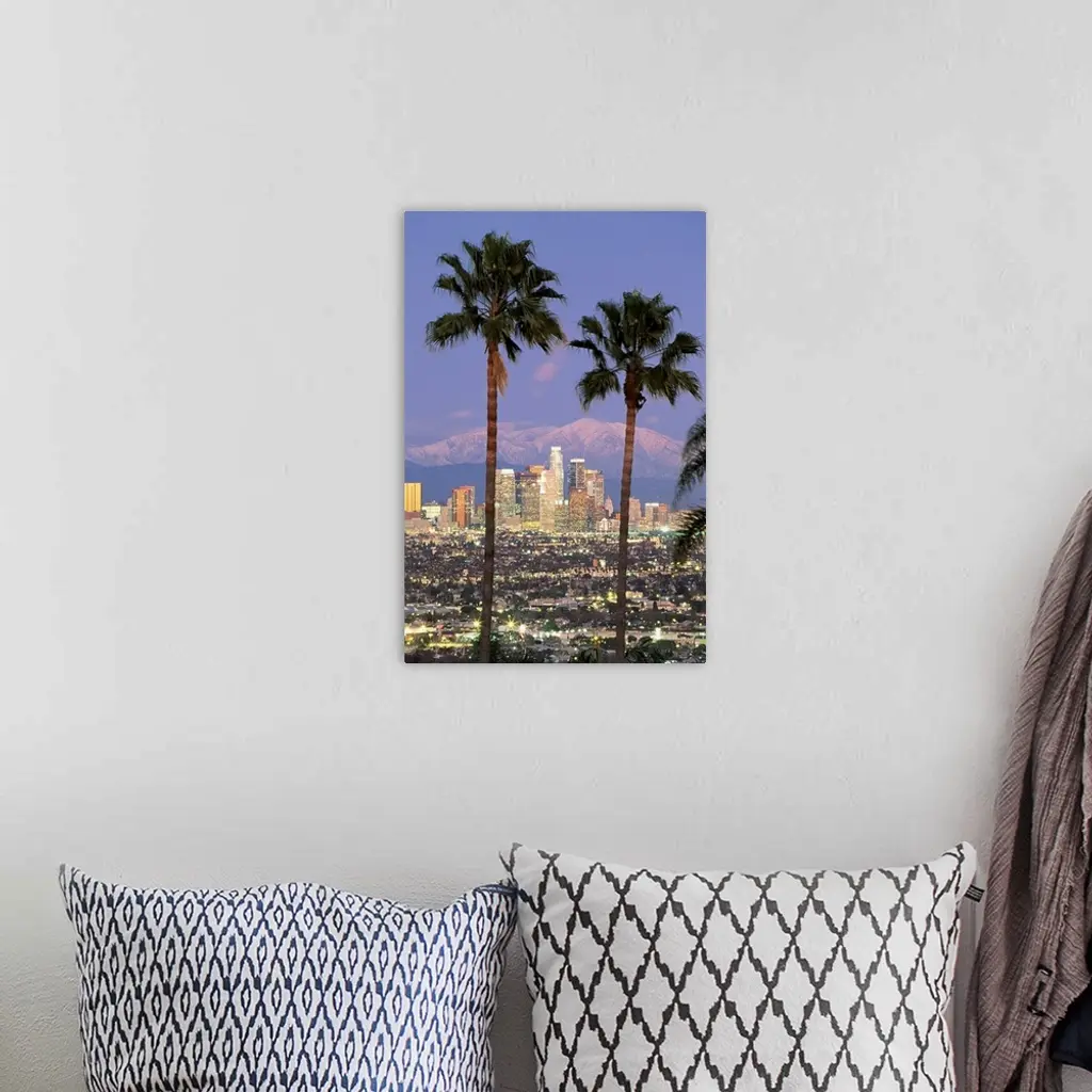 A vertical photograph of skyscrapers in the Los Angelesos skyline framed by two palm trees and mountains in the background.