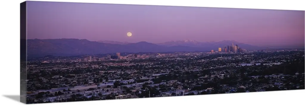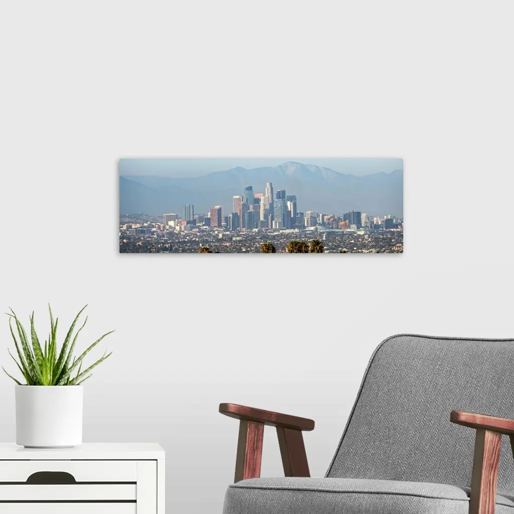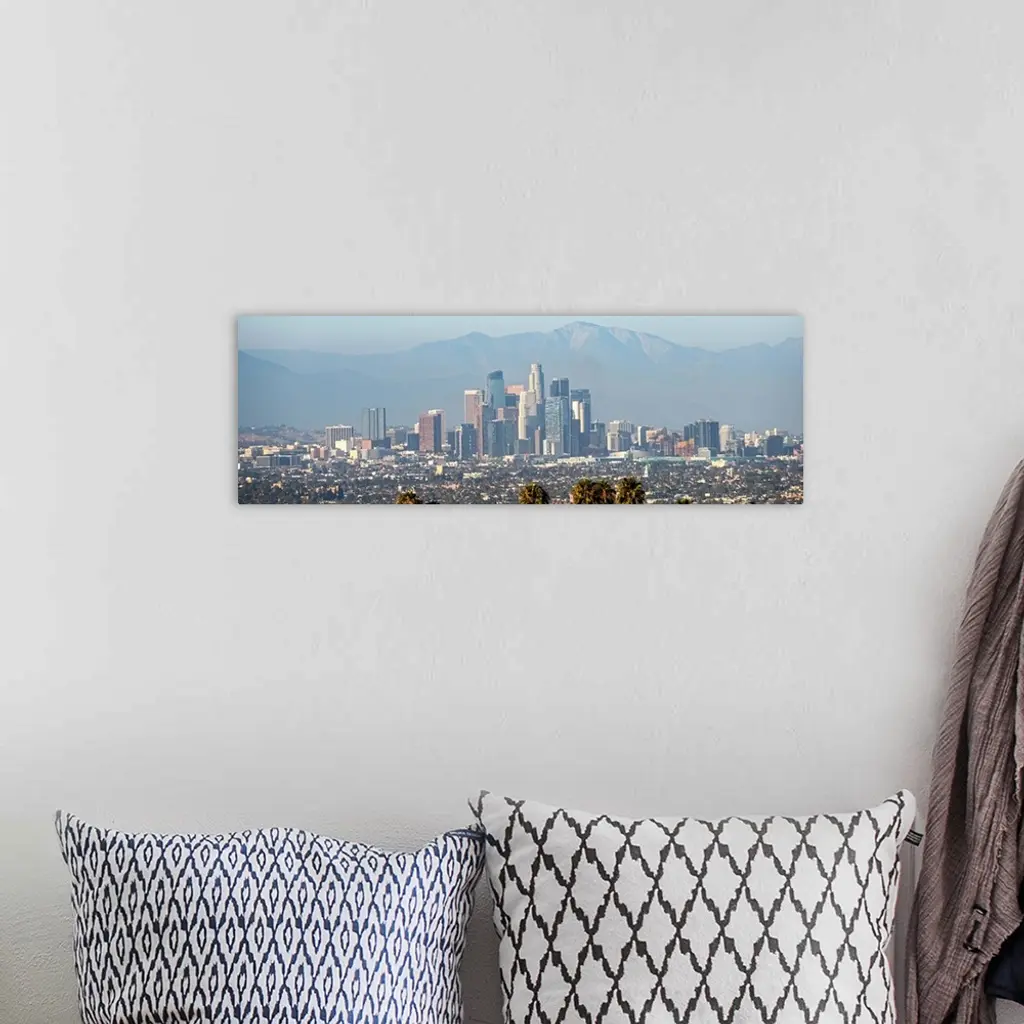Panoramic photograph of the Los Angeles, California skyline with mountains in the background and palm trees in the foreground on a hazy day.