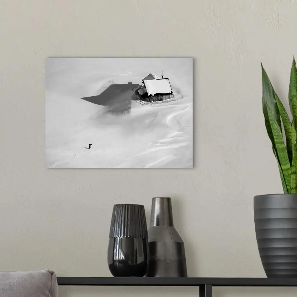 Aerial view of a skier making his way back to his house in the middle of an empty landscape with thick snow.