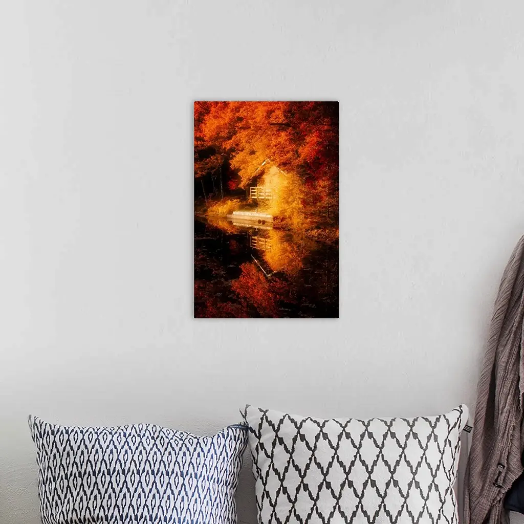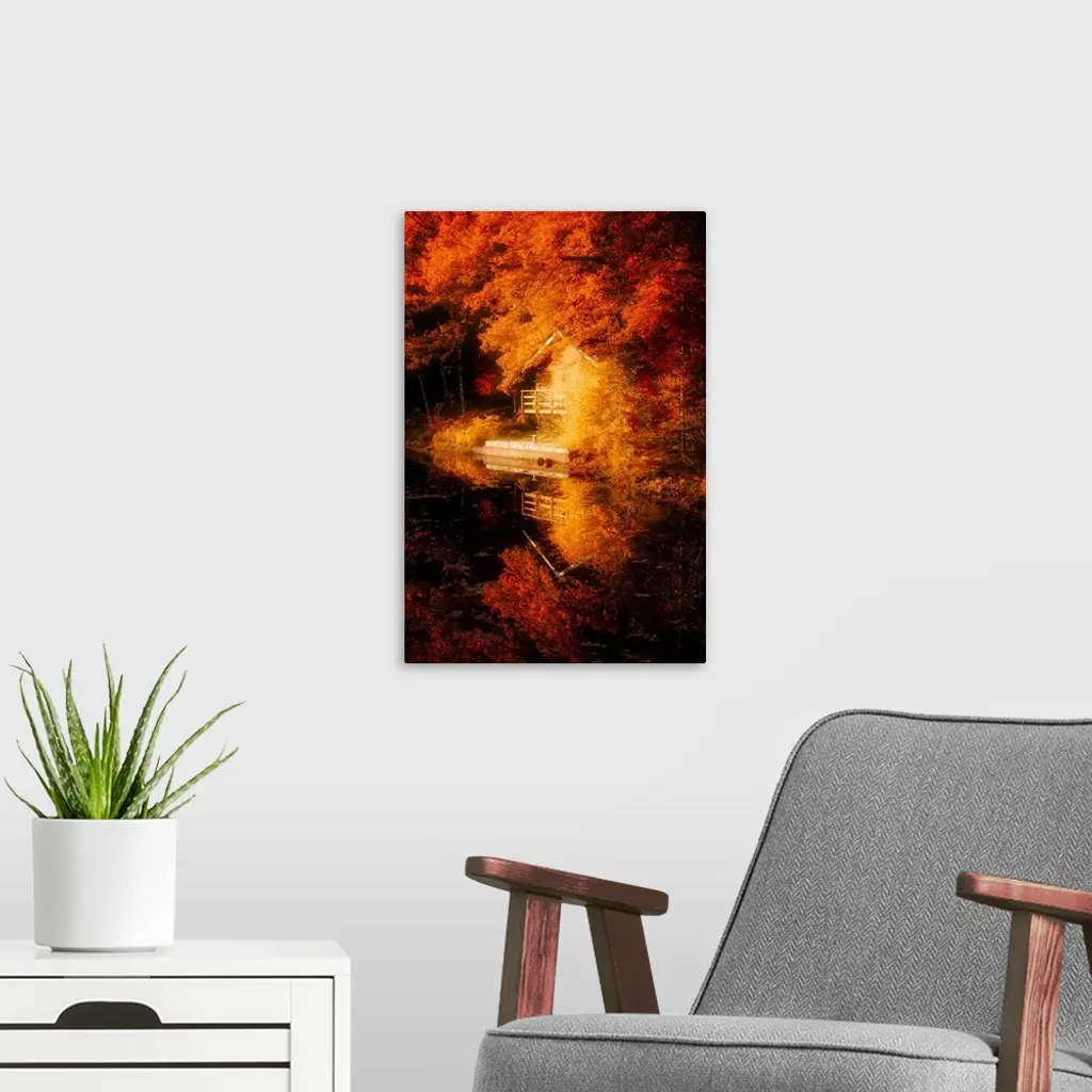 A small house at the edge of the water with deep orange leaves surrounding it.