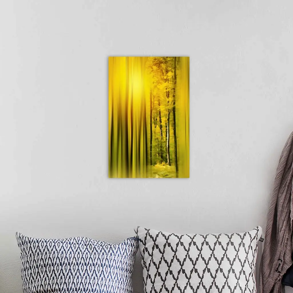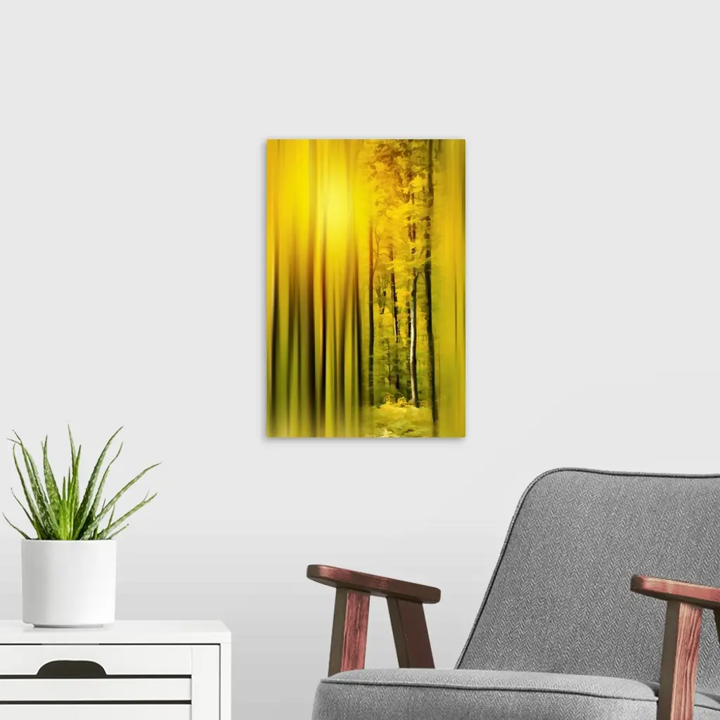 Photograph of a golden lit forest with trees in focus on the middle right and a blurred surrounding.