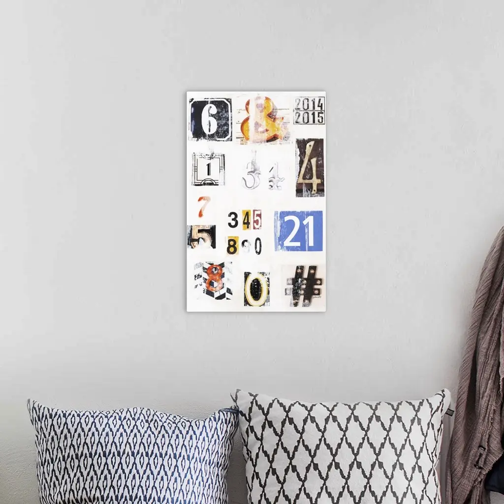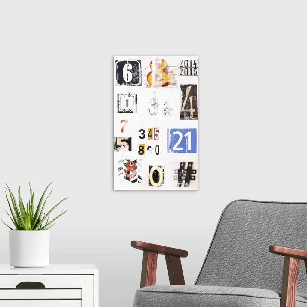 Contemporary art with uniquely designed numbers and signs with a vintage feel on a white background.
