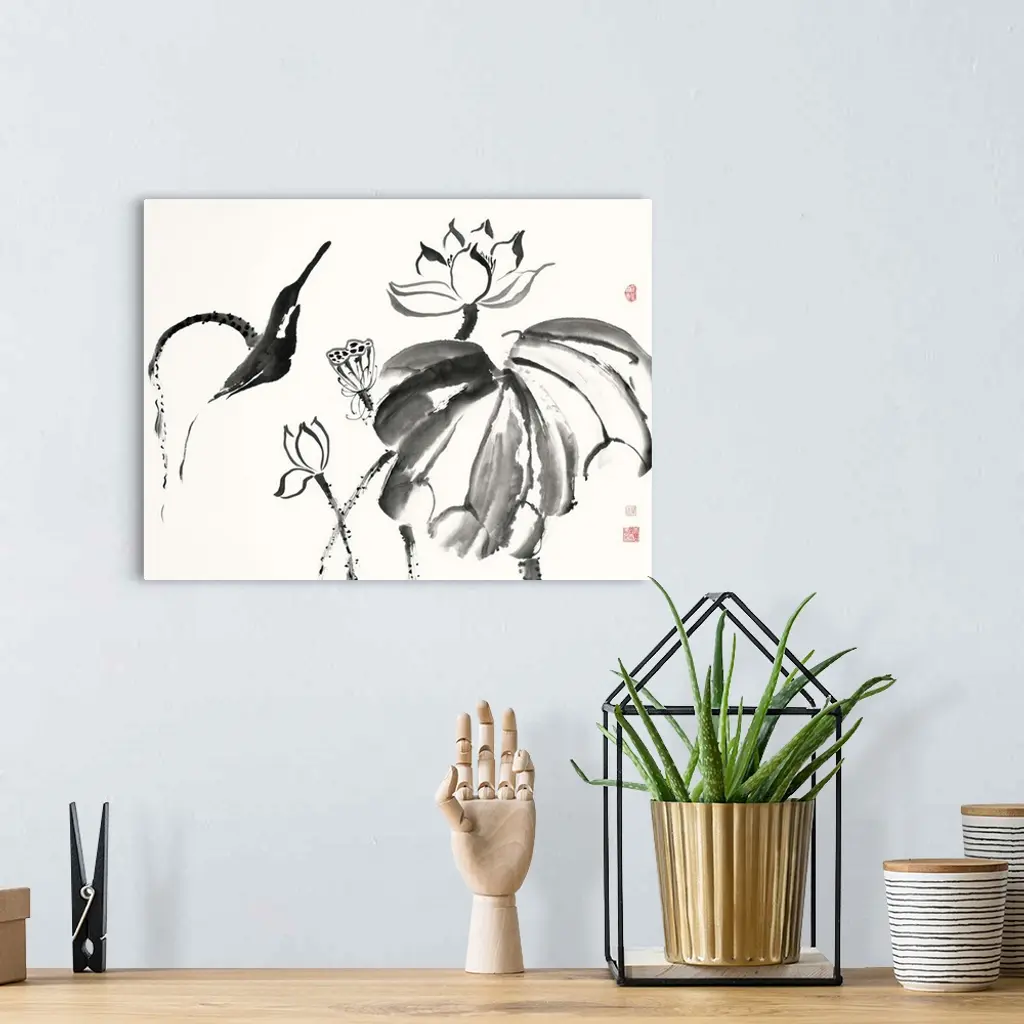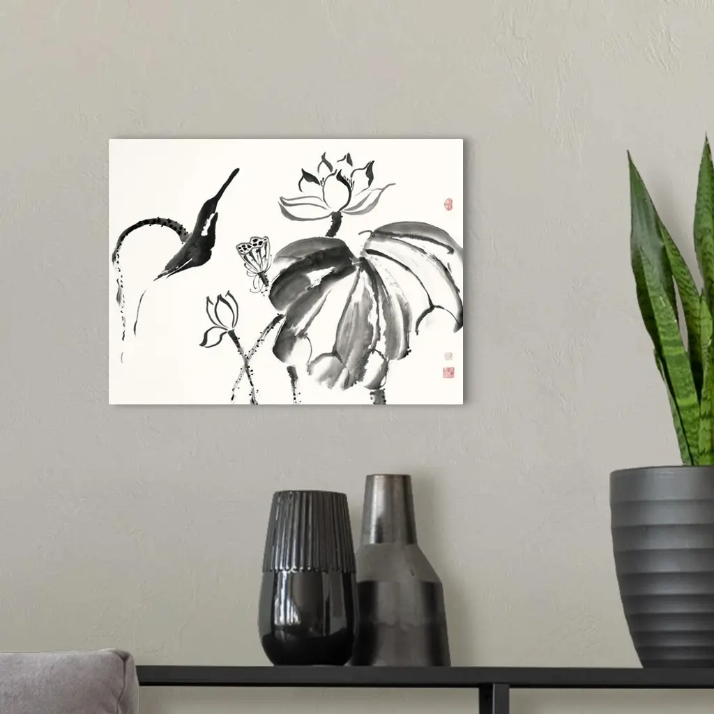 Illustrations of free formed lotus flowers in black watercolor with red Japanese symbols on the side.