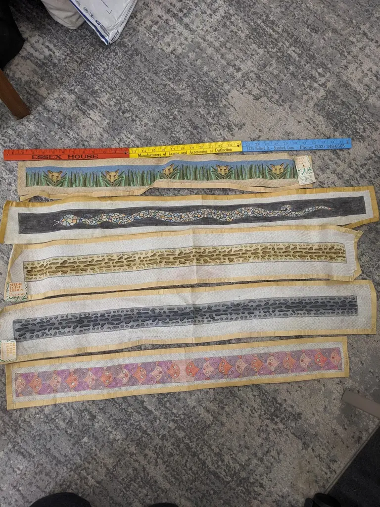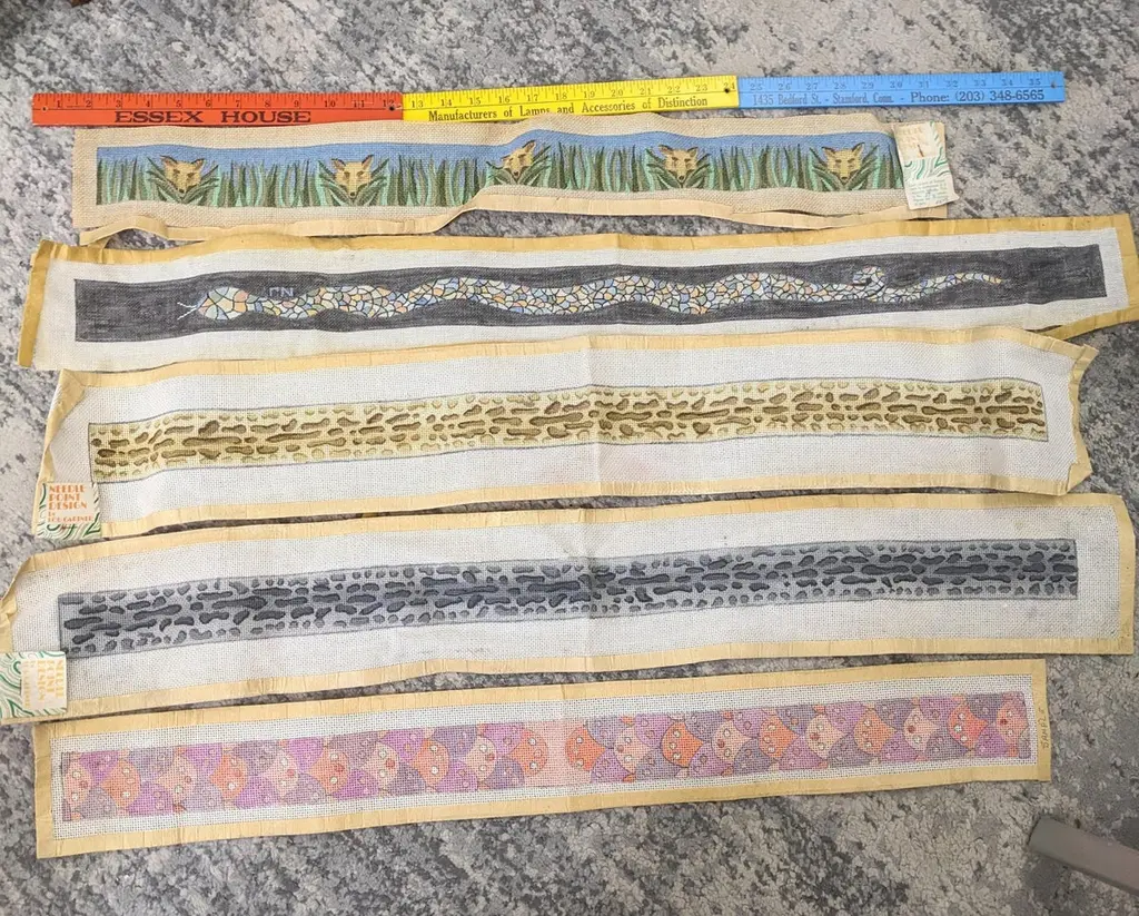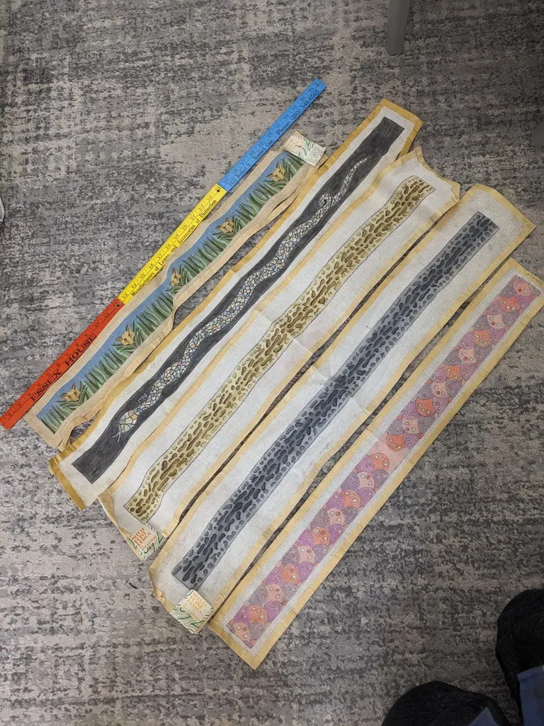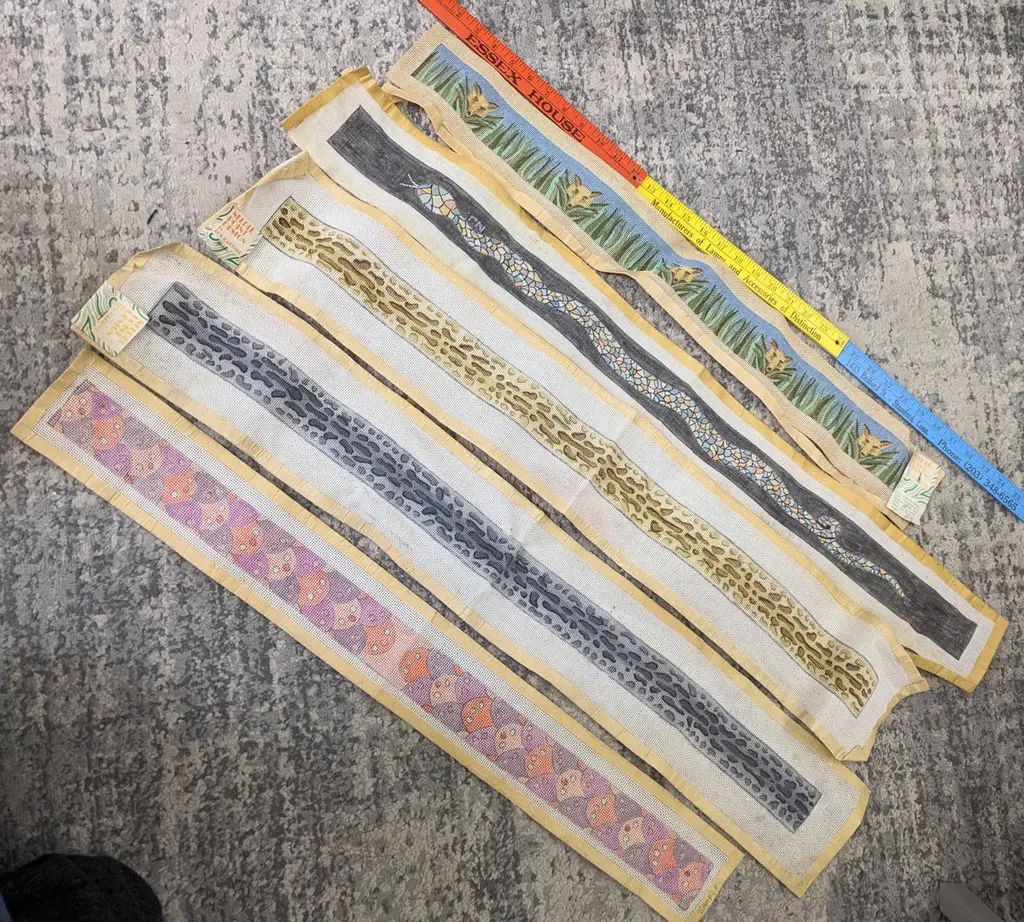 Hand painted Lou Gartner Needlepoint Blanks, Belts/Straps from the 1960s-70s from his estate. The longer ones are likely belts or pulls and the shorter ones (4 pcs) are straps for luggage racks (which require 2). 1970's USA.