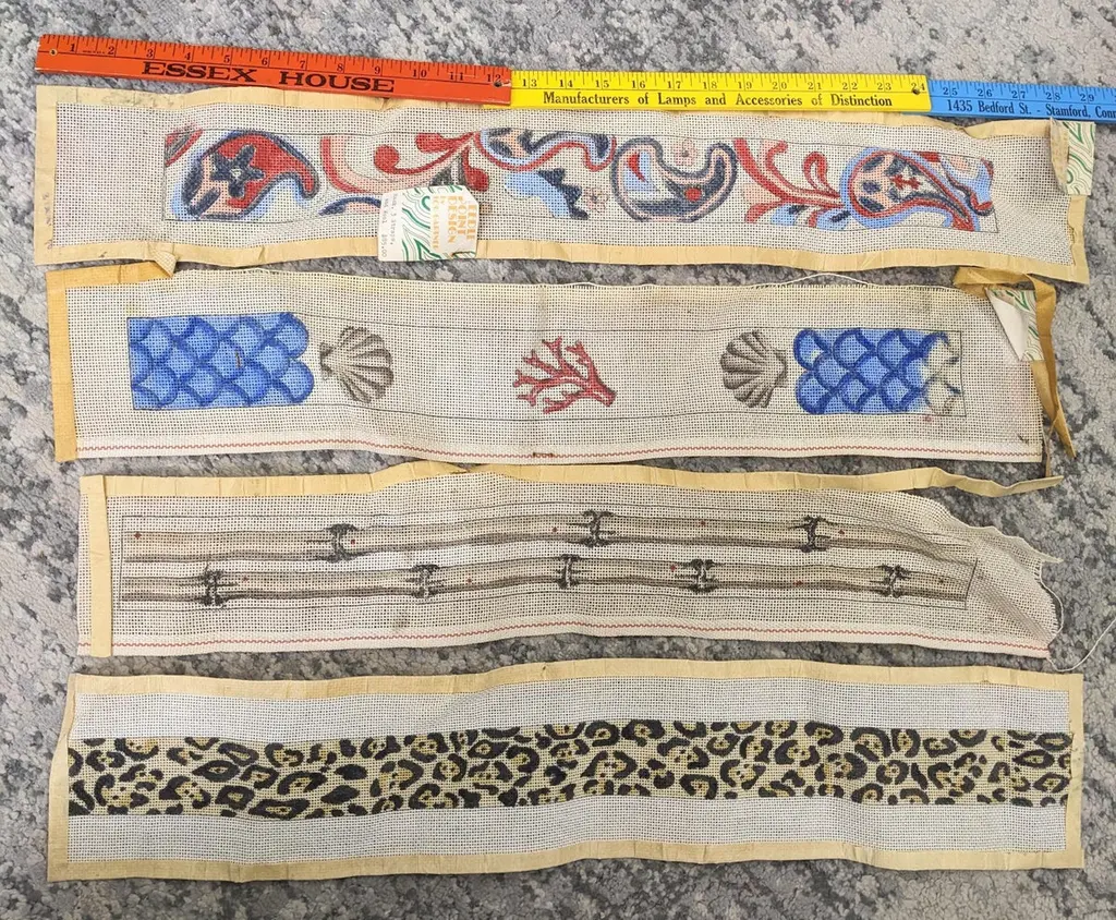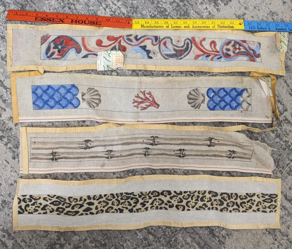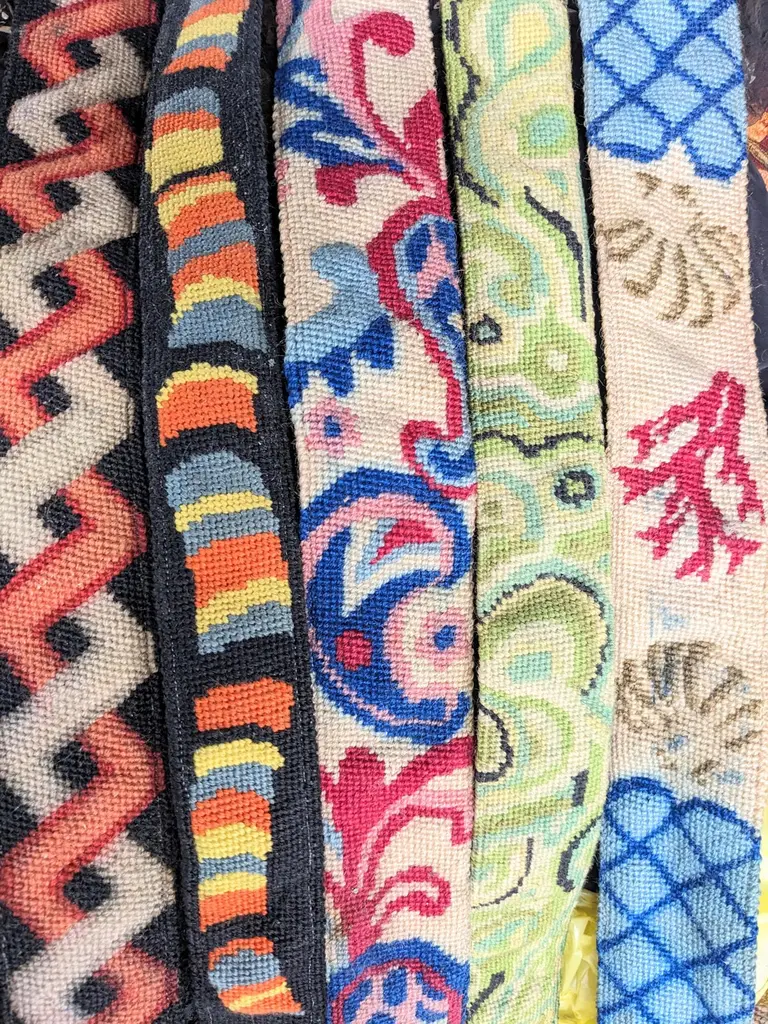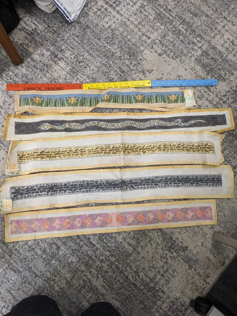 Hand painted Lou Gartner Needlepoint Blanks, Belts/Straps from the 1960s-70s from his estate. The longer ones are likely belts or pulls and the shorter ones (4 pcs) are straps for luggage racks (which require 2). 1970's USA.