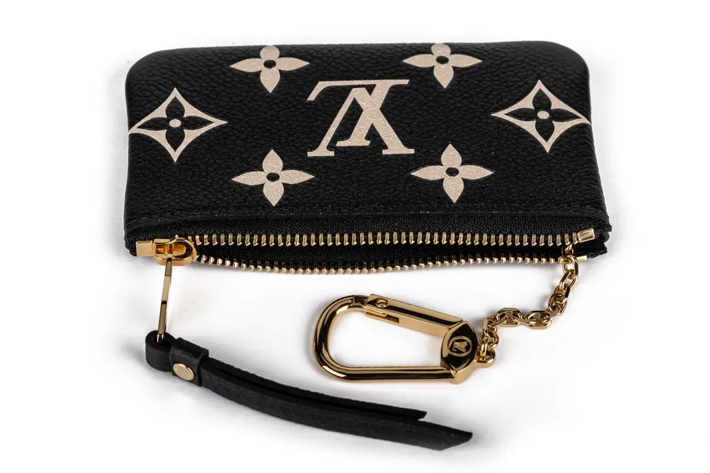 The Louis Vuitton Empreinte Monogram Giant Key Pouch in black is a chic and very practical accessory, crafted of Louis Vuitton monogram-embossed calfskin leather in black and beige. The polished gold snap opens the crossover flap to a matching leather interior with a D-ring clasp.