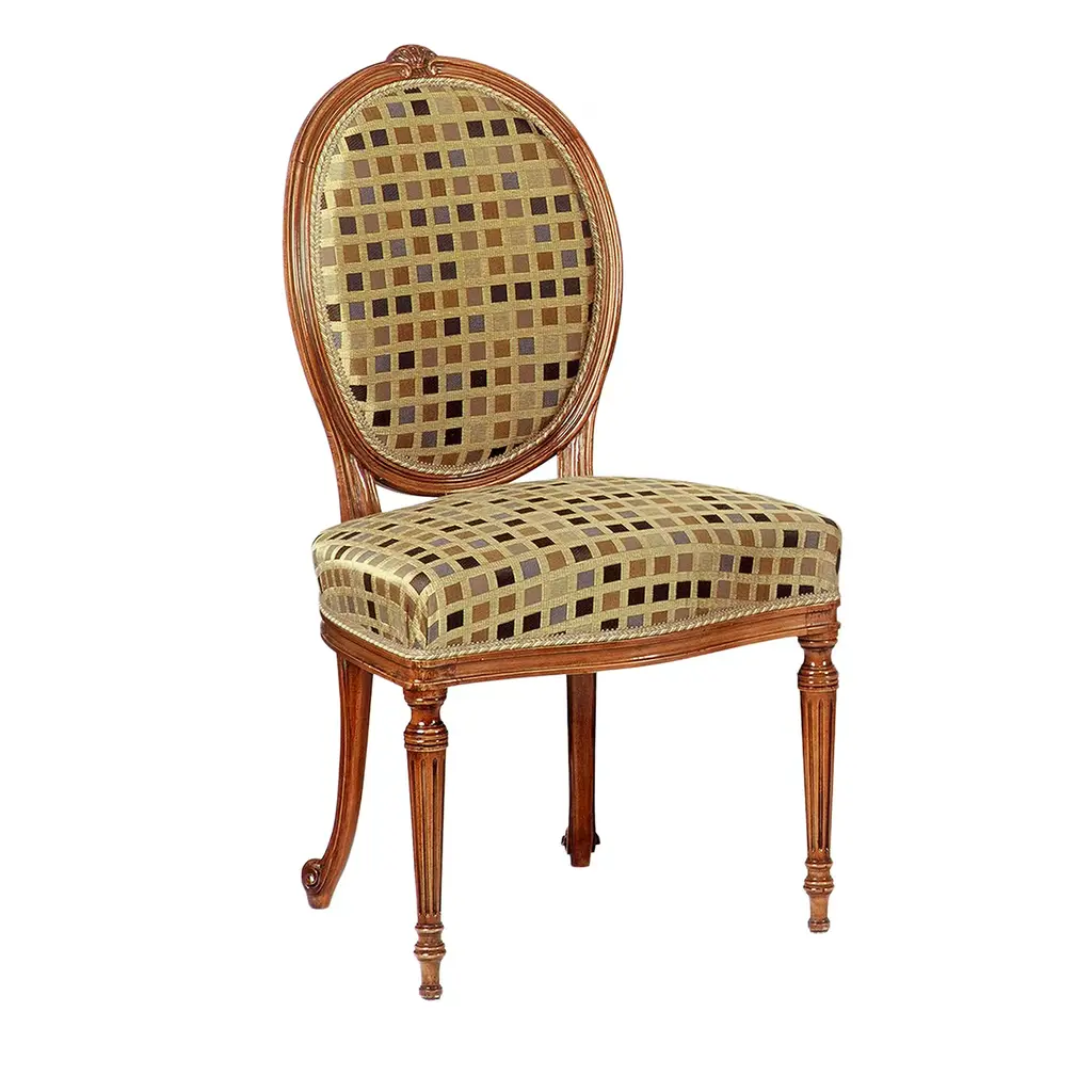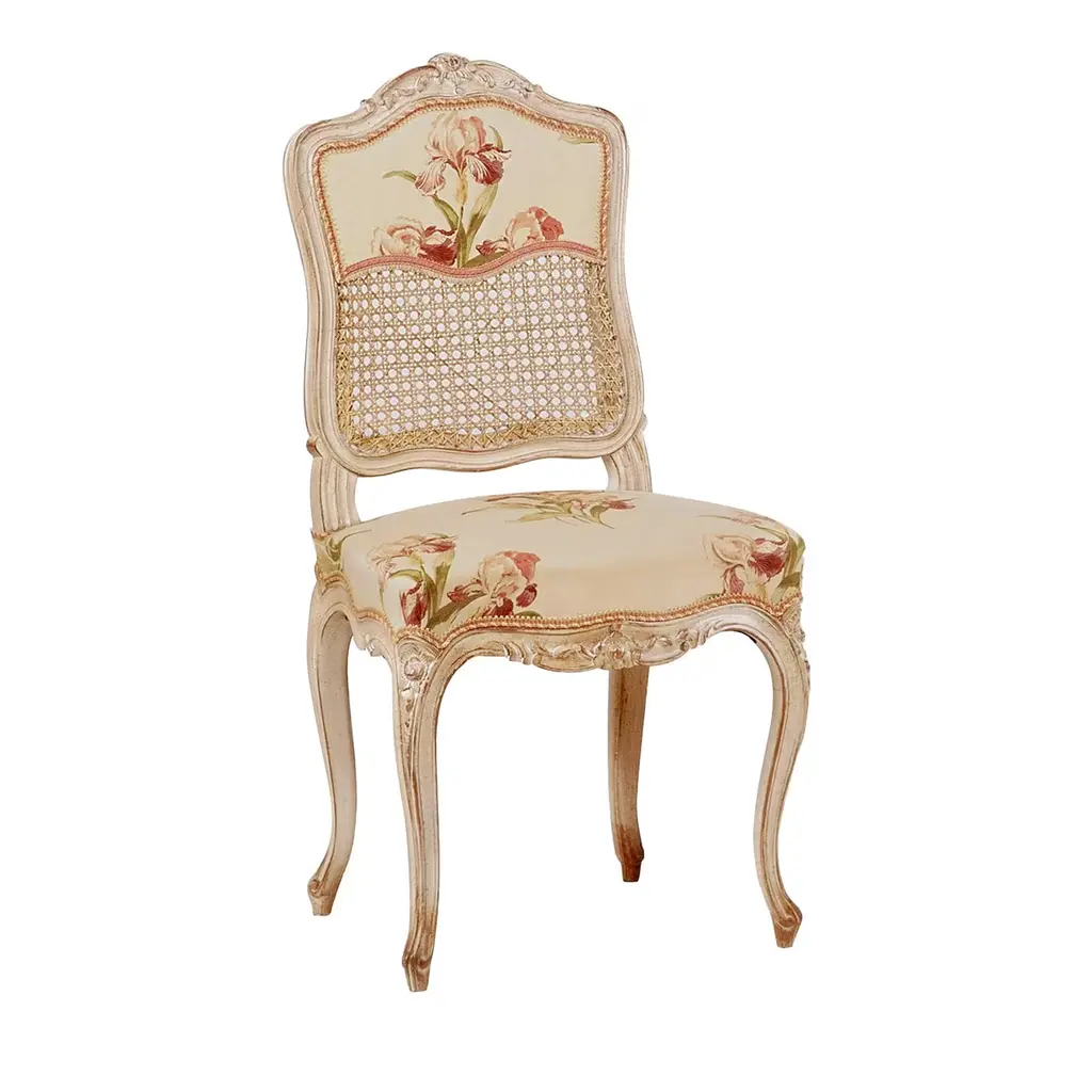 This superb chair in shellac-finished beech singularly reproduces an original design from Louis XVI's reign (1774-1793). Handcrafted following French ebony carpenters' traditional methods, it boasts minute textural detailing and an airy Vienna straw backrest. Utmost comfort is ensured by the cushioned seat covered in a patterned red fabric named "Il Giardino del Paradiso".