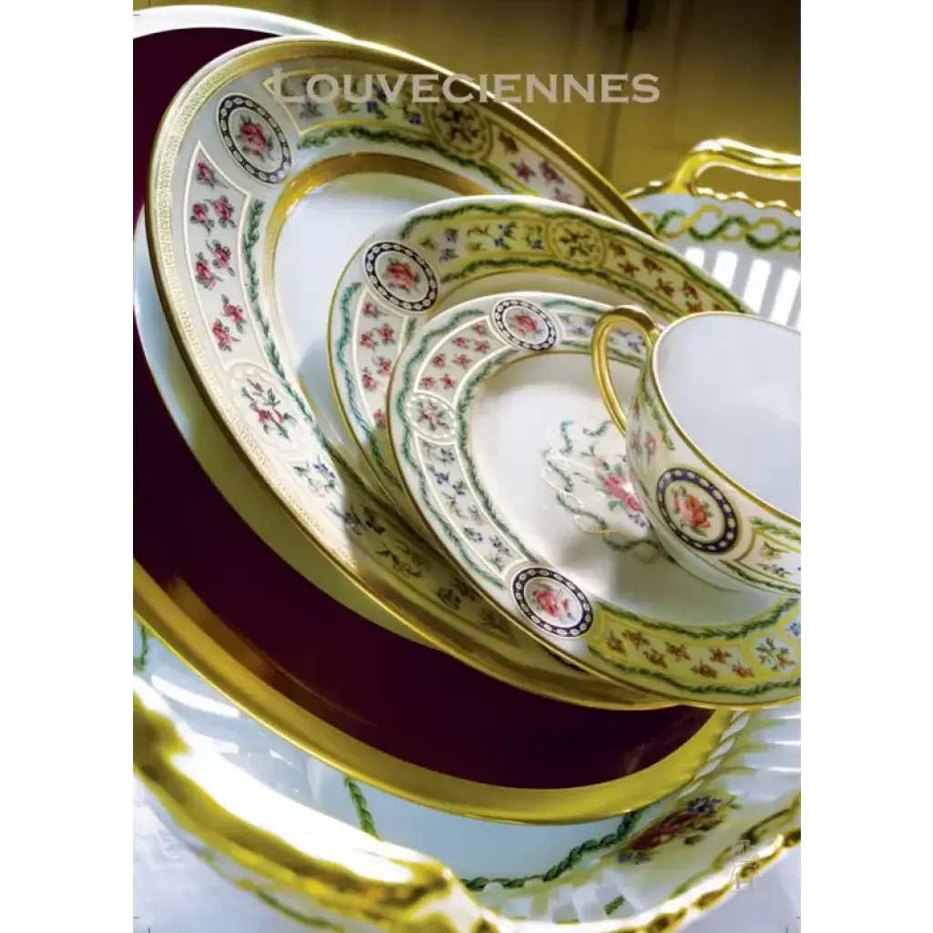 Delicate roses and vines adorn the border of this classic dinnerware collection from Haviland. 5-Piece Place setting includes Dinner plate, Dessert Plate, Bread & Butter Plate, Tea cup & Tea Saucer. Haviland Porcelain was founded by David Haviland, an American who moved from New York to France after he was brought a broken tea cup to match and recognized the quality and color of the old piece of porcelain. Filled with curiosity, he went to France to find the factory where the cup had been made, but the samples he was sent were not up to his standards. So in 1841, he moved to Limoges to set up his own factory. Traditional French dinnerware was usually produced in Limoges and sent to Paris for decoration. Haviland insisted on setting up a studio within his factory to have more control over the designs. Renowned artists, including Cocteau, Dali, and Kandinsky have played a role in the company's designs. Today, Haviland is one of the premier names in French porcelain dinnerware, sought by collectors all over the world. Clients have included the White House, Empress Eugenie, General de Gaulle, Jacques Chirac, the Emperor of Japan, and the Royal Court of Morocco.