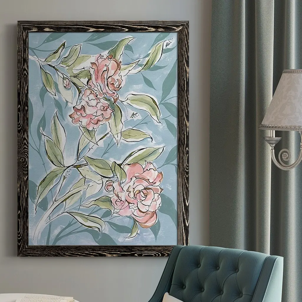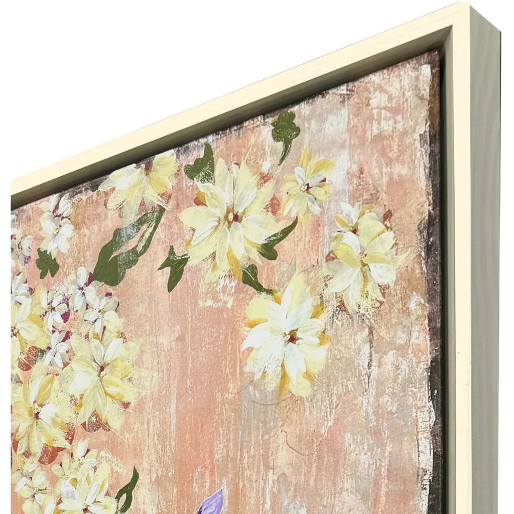 Exclusive giclee on canvas is hand embellished with hand painted flowers and gold leaf. Hand stretched and mounted in a whitewash wood floater frame.