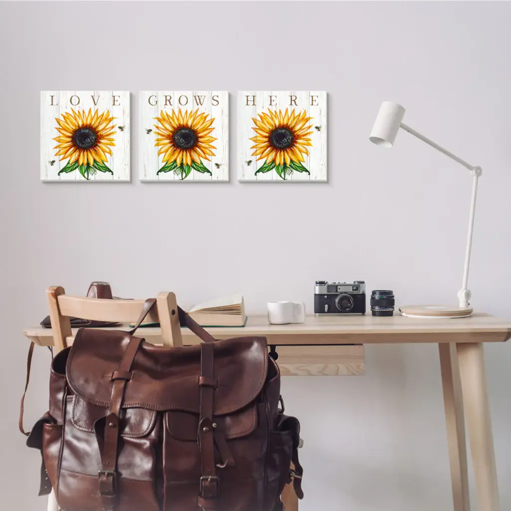 Love Grows Here Phrase Yellow Sunflowers Honey Bees,3pc, Each 12 X 12
