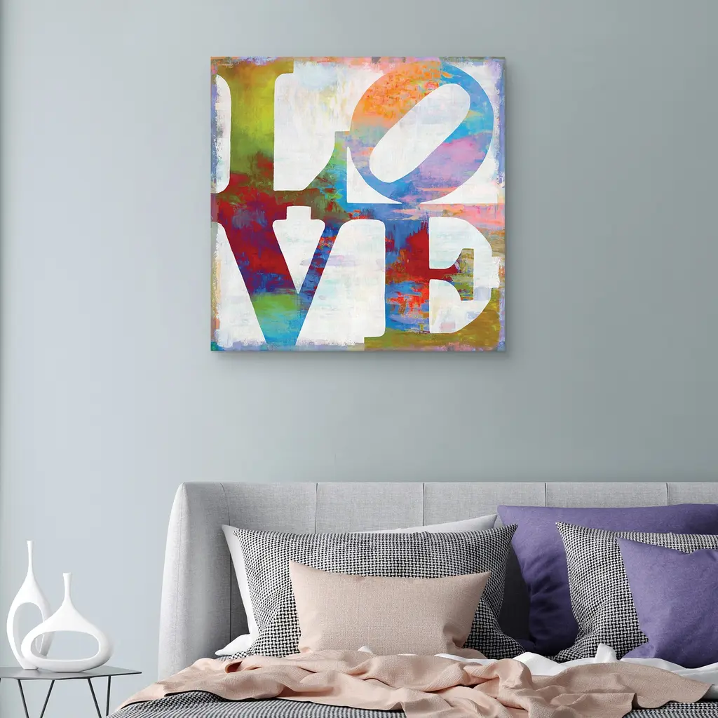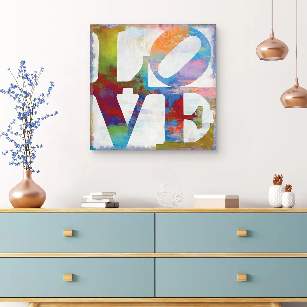 The famous LOVE image has experienced many iterations over time. Jamie MacDowell's version of this iconic image painted in a rainbow palette makes a stunning piece to hang in an office, home, or small business. LOVE is a high-quality canvas art print that comes ready-to-hang.