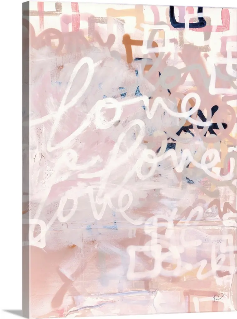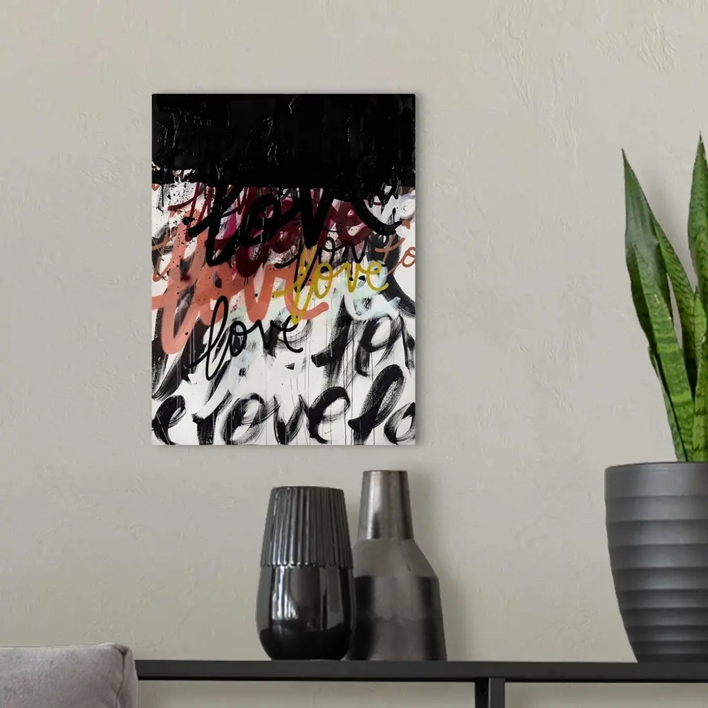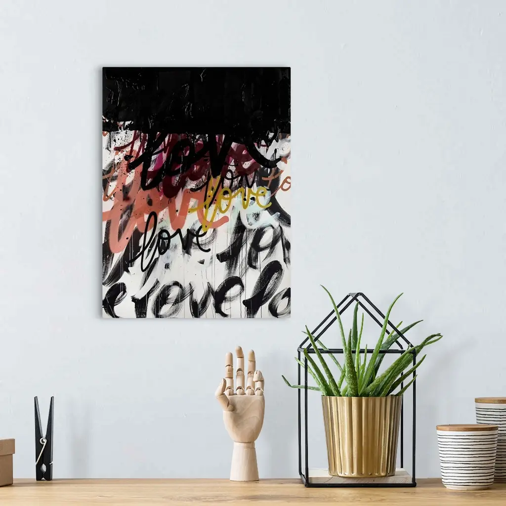 A powerful statement piece of contemporary art featuring the word love in a handwritten font on a mostly white background