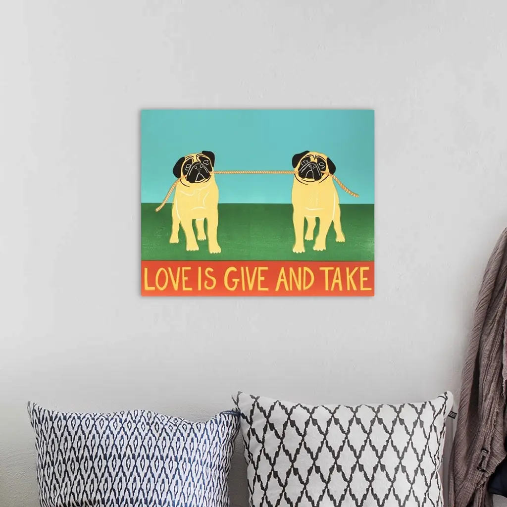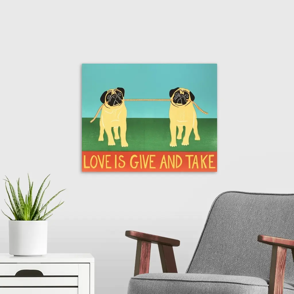 Illustration of two pugs playing tug-a-war with a rope and the phrase "Love is Give and Take" written at the bottom.
