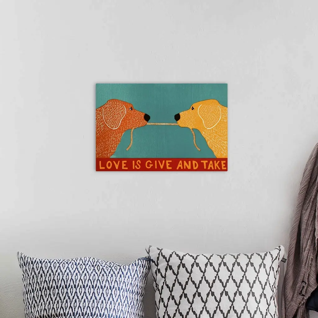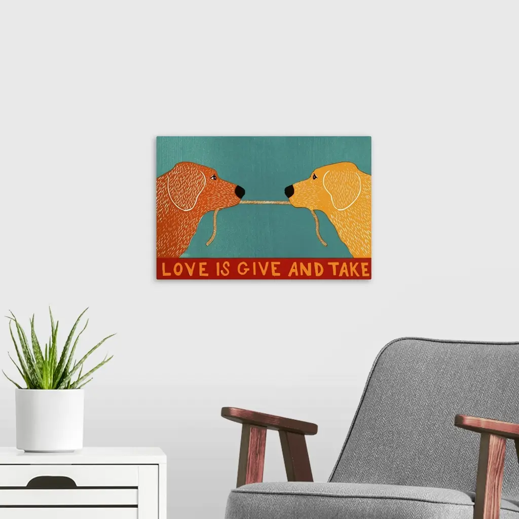 Illustration of a golden retriever and a yellow lab playing tug-a-war with a rope and the phrase "Love is Give and Take" written at the bottom.