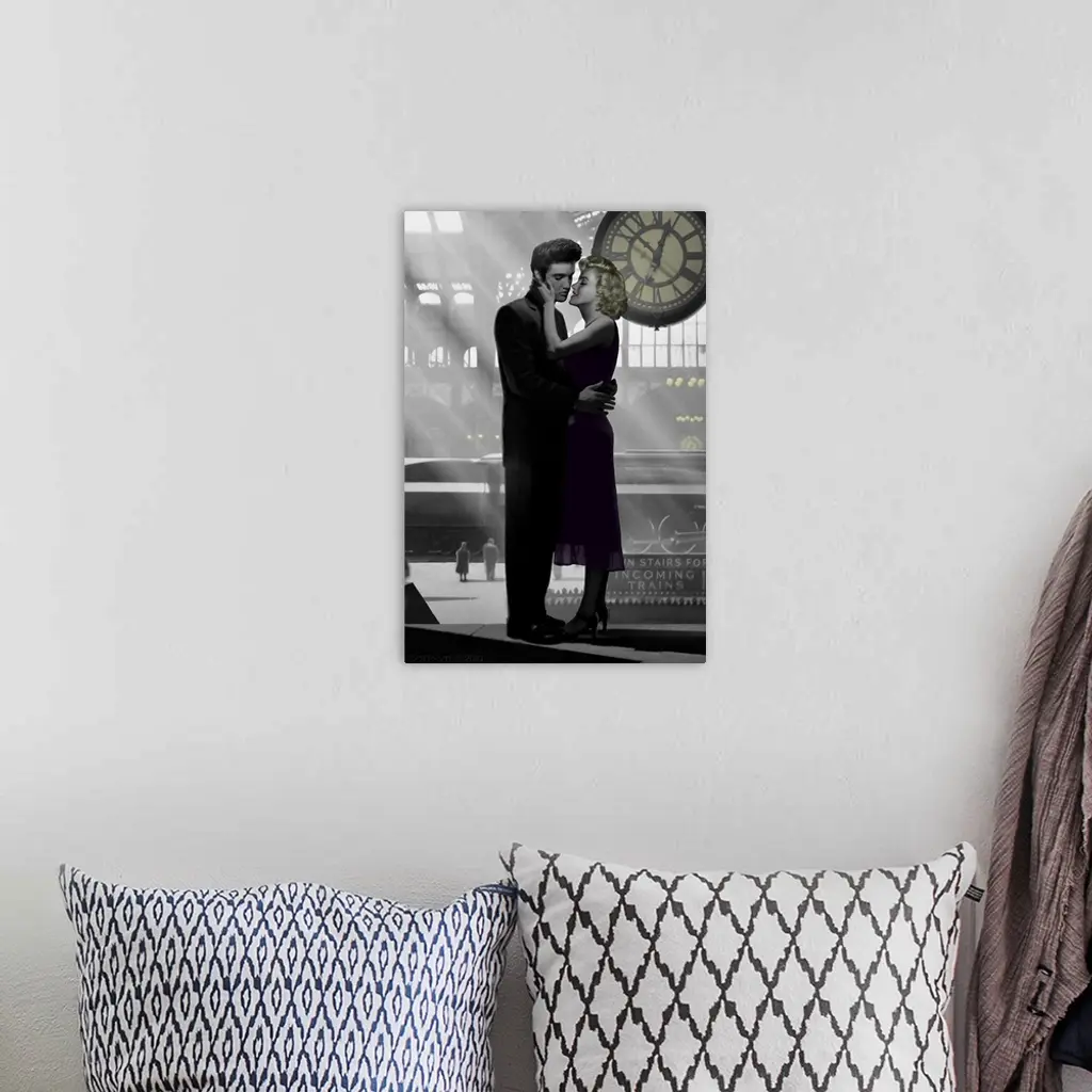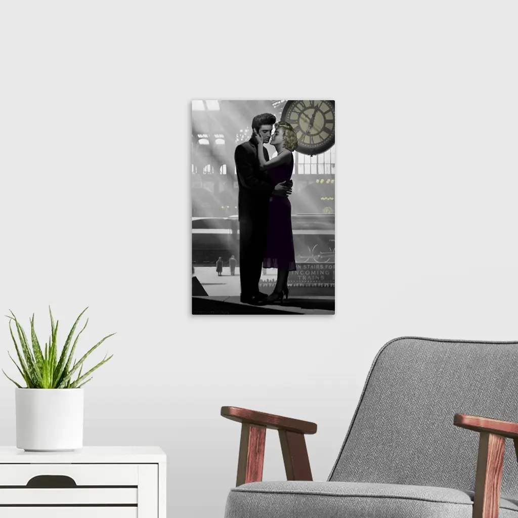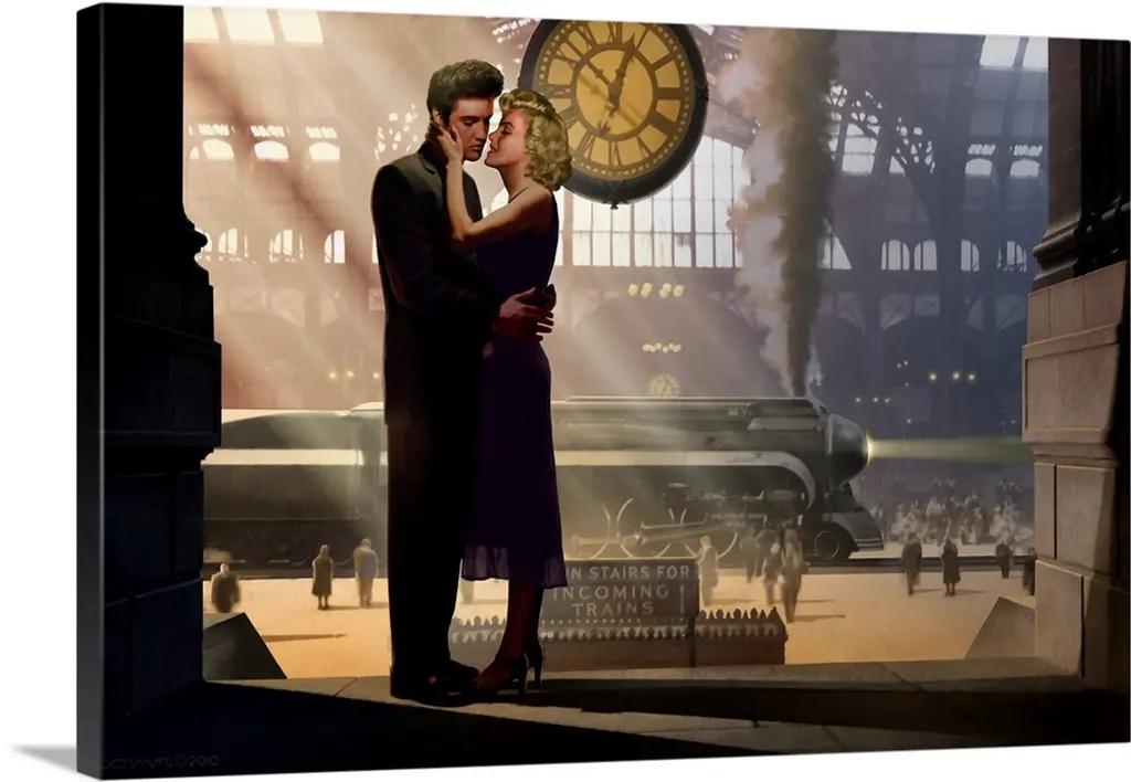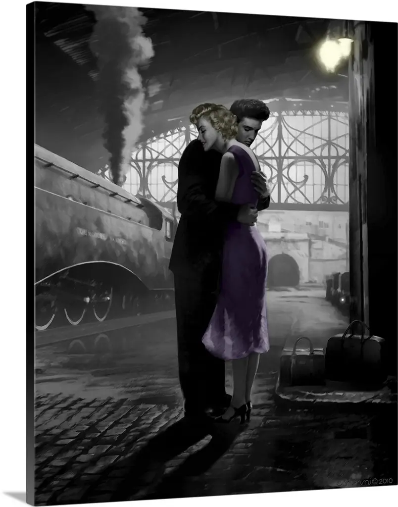 Chris Consani lends dark allure and masculine perspective to movie fantasy settings, showcasing iconic celebrities like Marilyn Monroe and Elvis at a train depot.