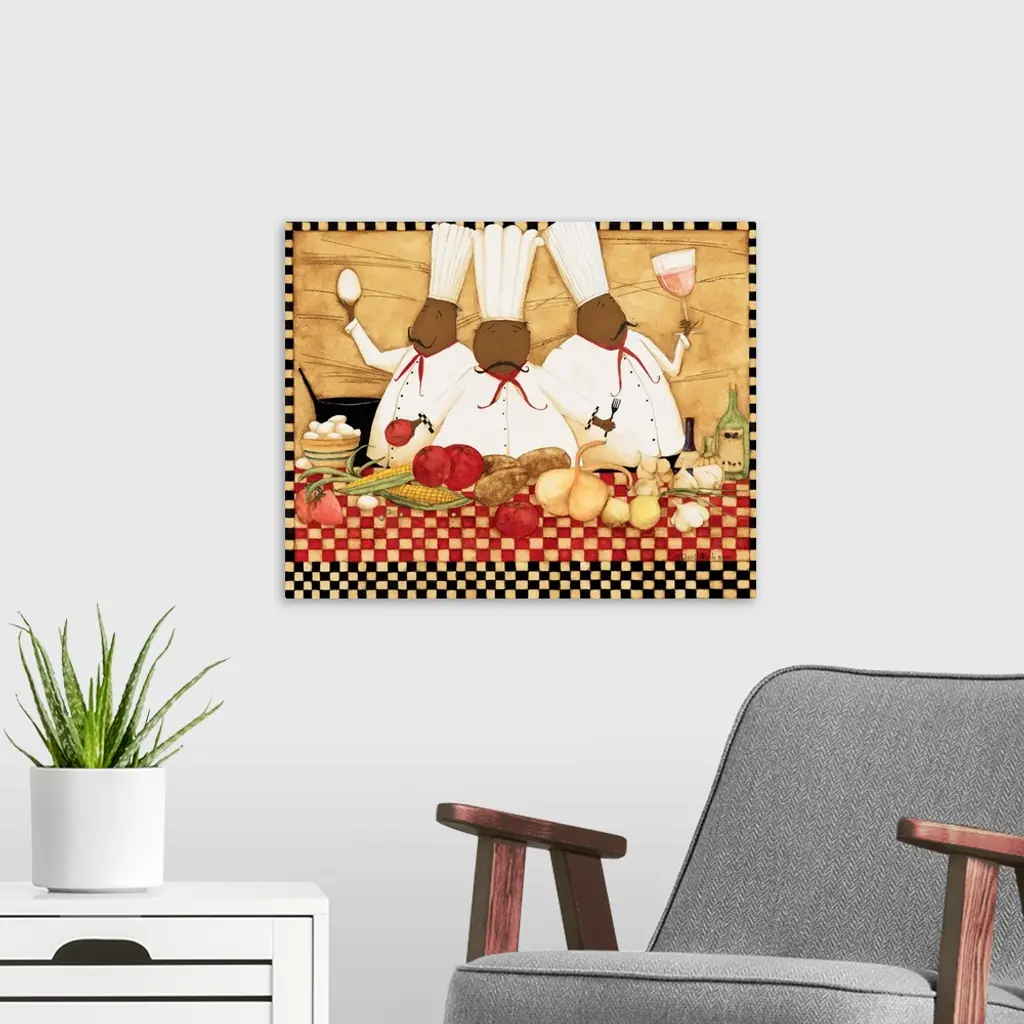 Three happy chefs, tasting wine, holding and egg, and preparing a meal.