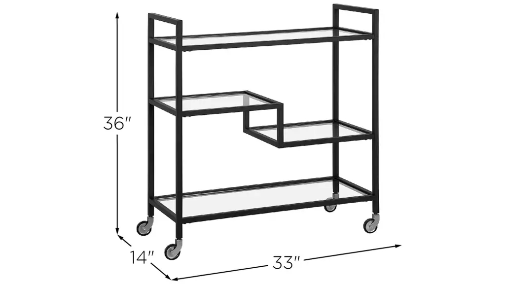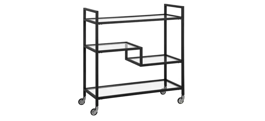This modern contemporary Lovett Bar Cart is the perfect addition to your dining room or entertaining space. A sturdy metal frame borders the glass table top and two-tiered shelves. The raised frame provides security for your bottles and mixers while the four wheels provide easy mobility from room to room. Not a party animal? Re-purpose this piece as a coffee station, mobile vanity, or nightstand!
