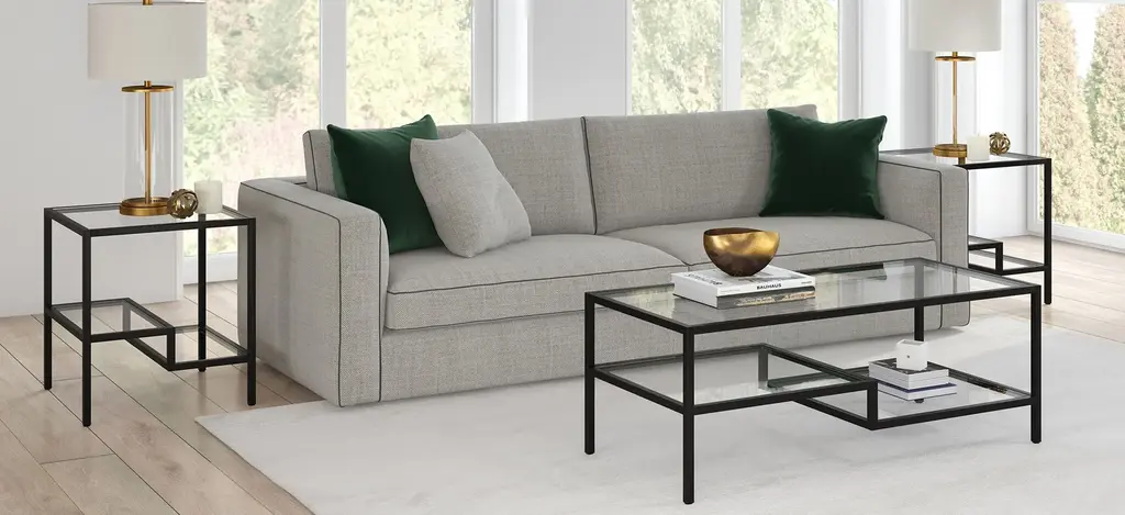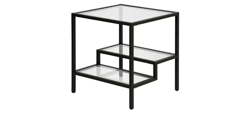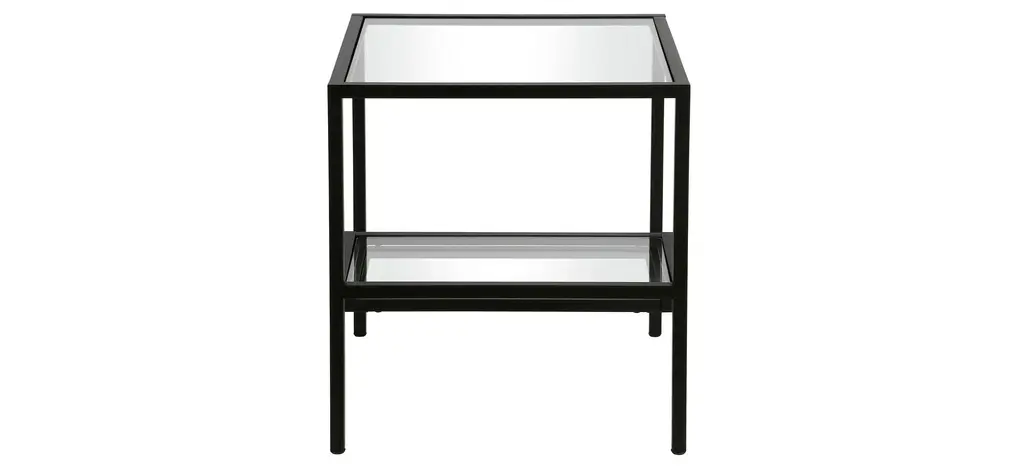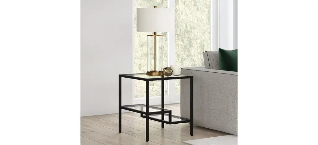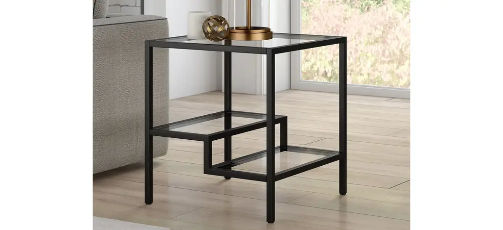This industrial display box styled Lovett side table features a seamless blend of function and design. Easy to style, the tempered glass top, metal shelf and blackened bronze finish make it the perfect addition to your living room or den ensemble.