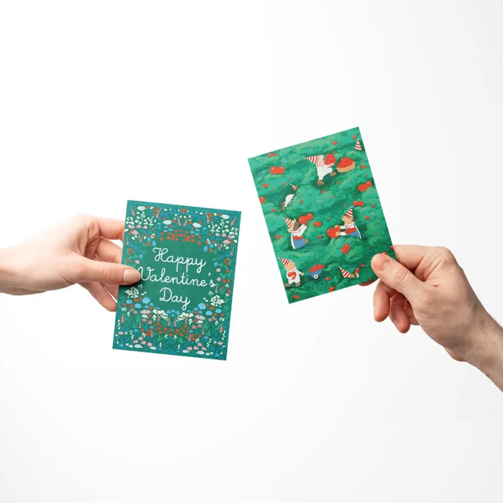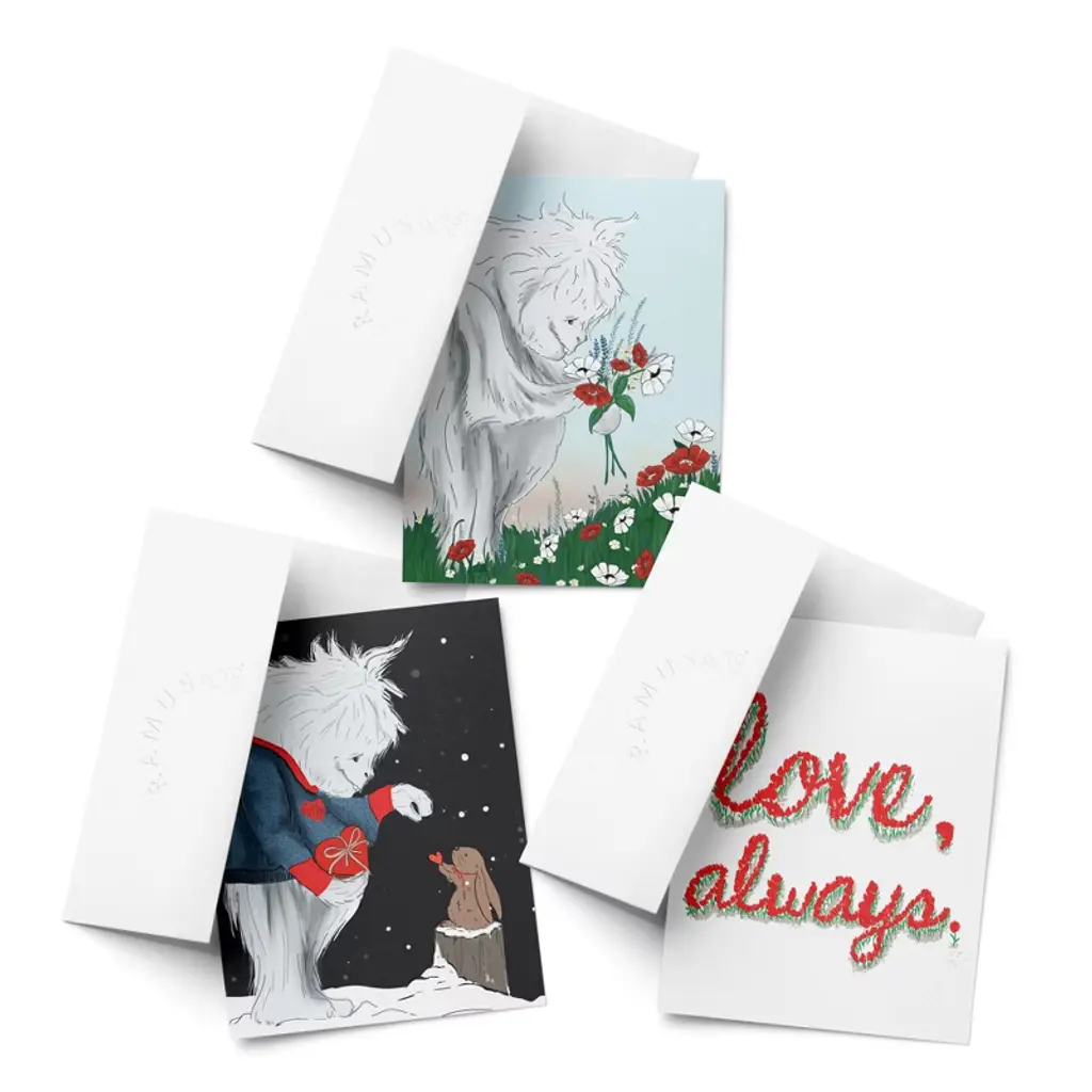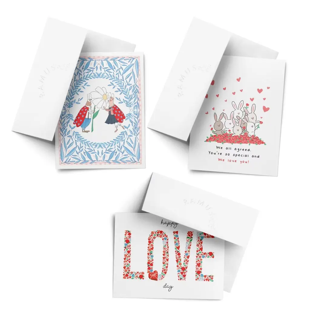 This 3-pack of assorted love/friendship/valentine's day greeting cards is elegantly illustrated by artist Ingrid Ramus, founder and owner of the Ramus & Co brand. The cards are blank inside. All greeting cards are made in the USA on heavyweight uncoated and locally-manufactured card stock. Each card is individually wrapped in PLA sleeves that meet both ASTM D6400 & EN 13432 standards. Each card is accompanied by a hand-embossed envelope made with heavyweight 95lb paper and a peel-and-stick flap - no licking envelopes here! All Ramus & Co. greeting cards are printed on FSC and SFI certified paper sourced from a regional mill that harnesses 66% of its energy from on-site sustainable sources, such as emission-free hydroelectricity and biomass co-generation from wood waste. Additionally, our greeting cards are thoughtfully packaged in bags made from certified compostable PLA material. Husband-and-wife team Calvin and Ingrid Ramus founded Ramus & Company in 2019, in New England, USA. Ingrid, the creative designer behind the brand, originates from Mexico, where she cultivated her skills in fashion and textile design. Drawing from her unique and inquisitive perspective on preppy style, Ingrid prolifically designs whimsical yet classic stationery and lifestyle items.