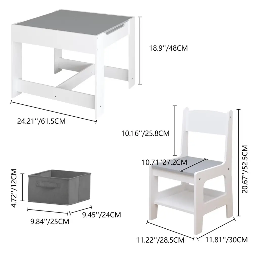 This children's 3-in-1 table and chair set is a multifunctional piece of furniture, perfect for nurseries and playrooms. The tabletop features a smooth chalkboard on one side to encourage children to draw and write, and a sophisticated gray play surface on the other side for building toy scenes, puzzles or playing with blocks.