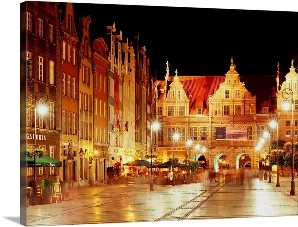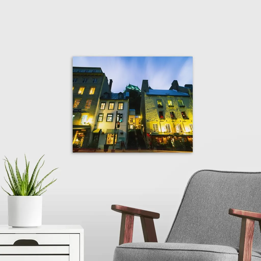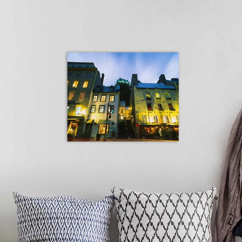 Low angle view of buildings lit up at dusk, Quebec, Canada wall art for home and office decor. Discover canvas art prints, photos, mural, big canvas art and framed wall art in GreatBigCanvas.com's varied collections.