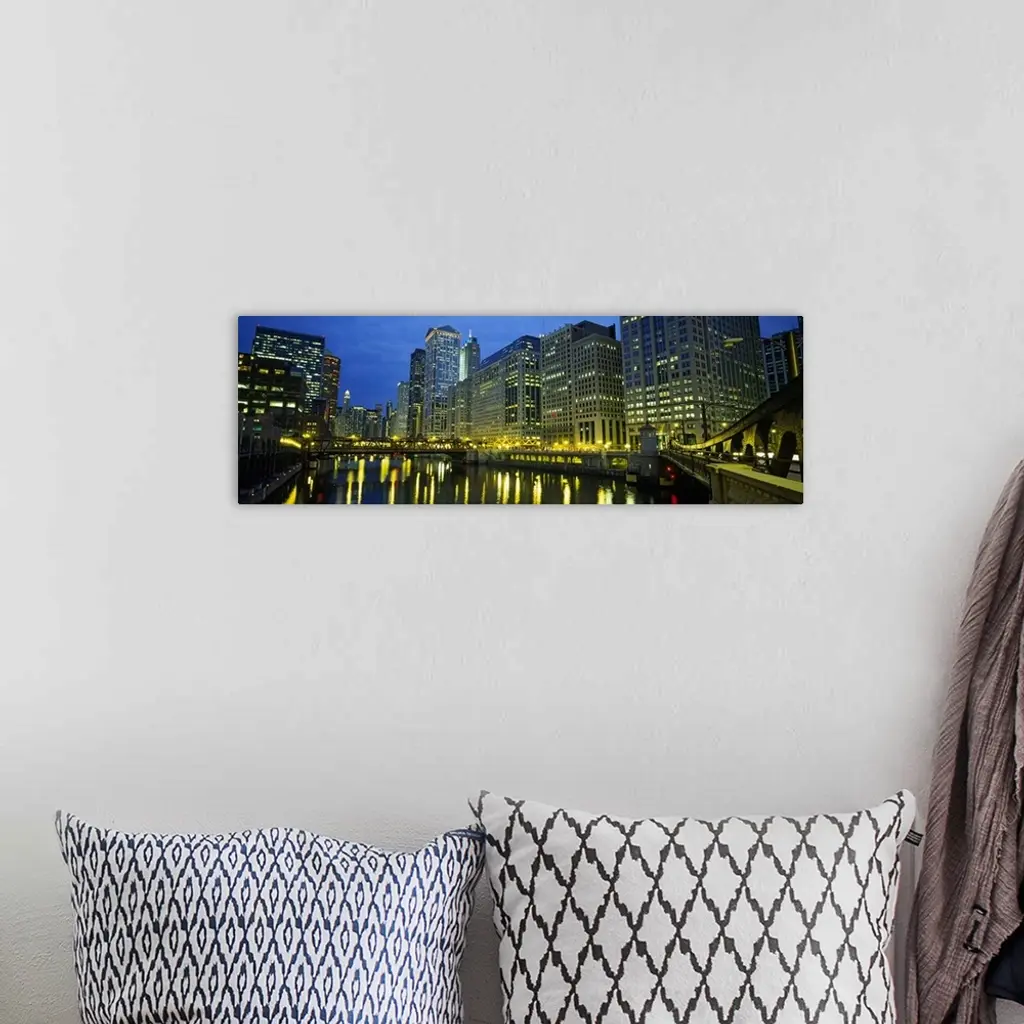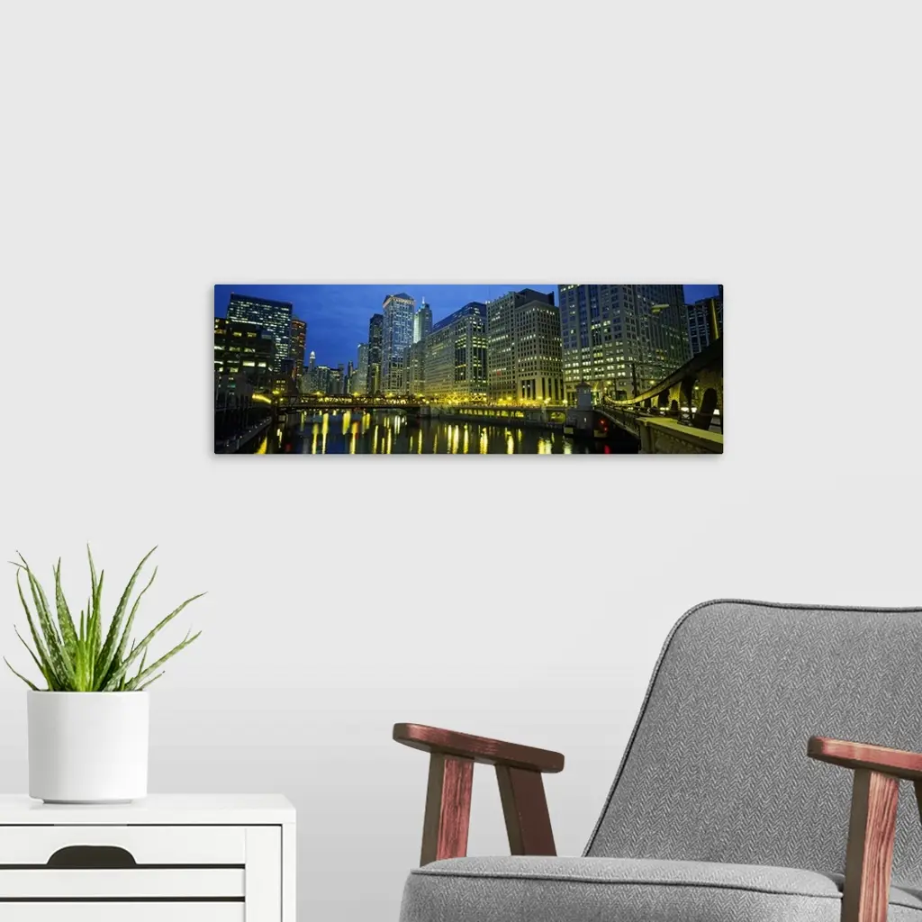 Low Angle View Of Buildings Lit Up At Night, Chicago River, Chicago, Illinois