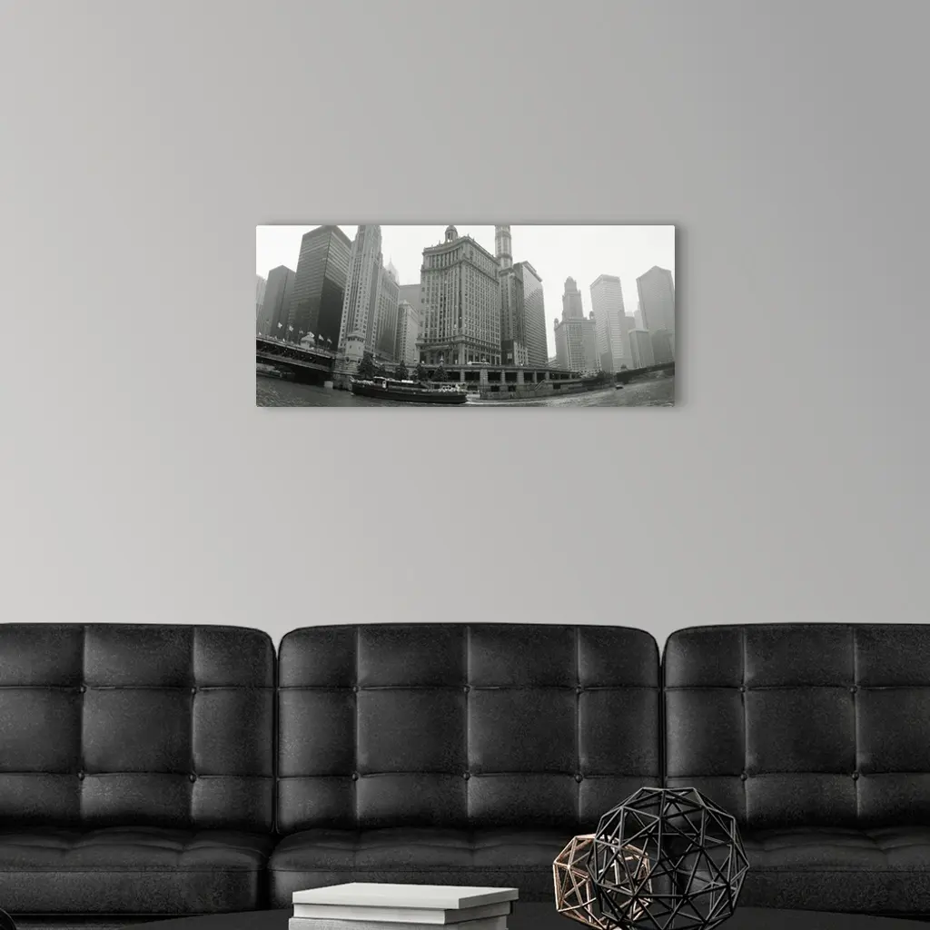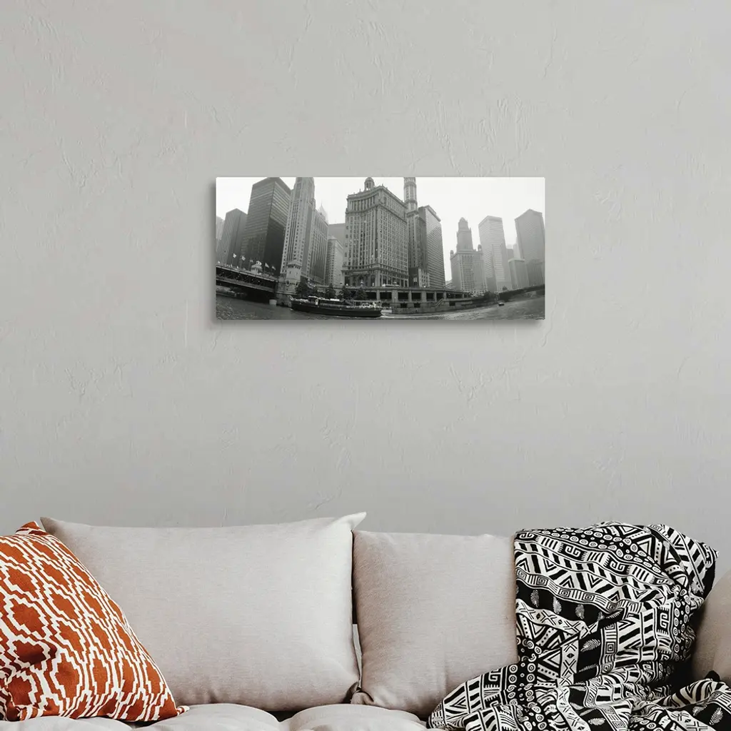 Large, horizontal photograph of boats and skyscrapers, taken at a low angle from the waterfront of Chicago, Illinois.