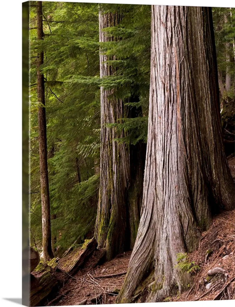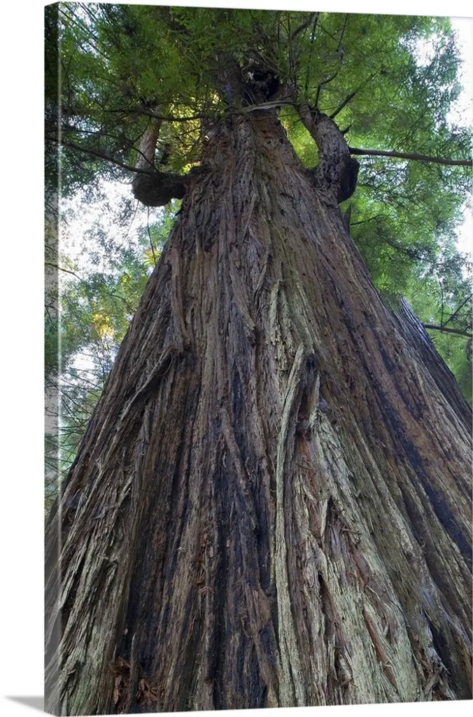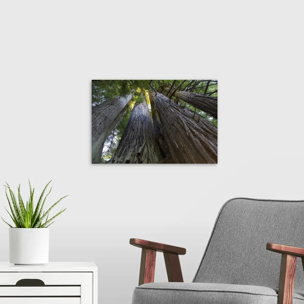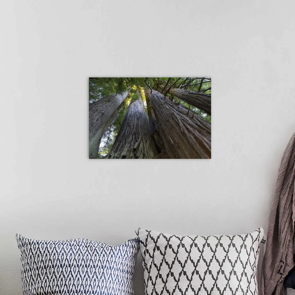 Big canvas photo art looking upwards at tree trunks with leaves at the top.