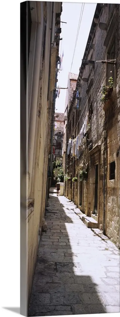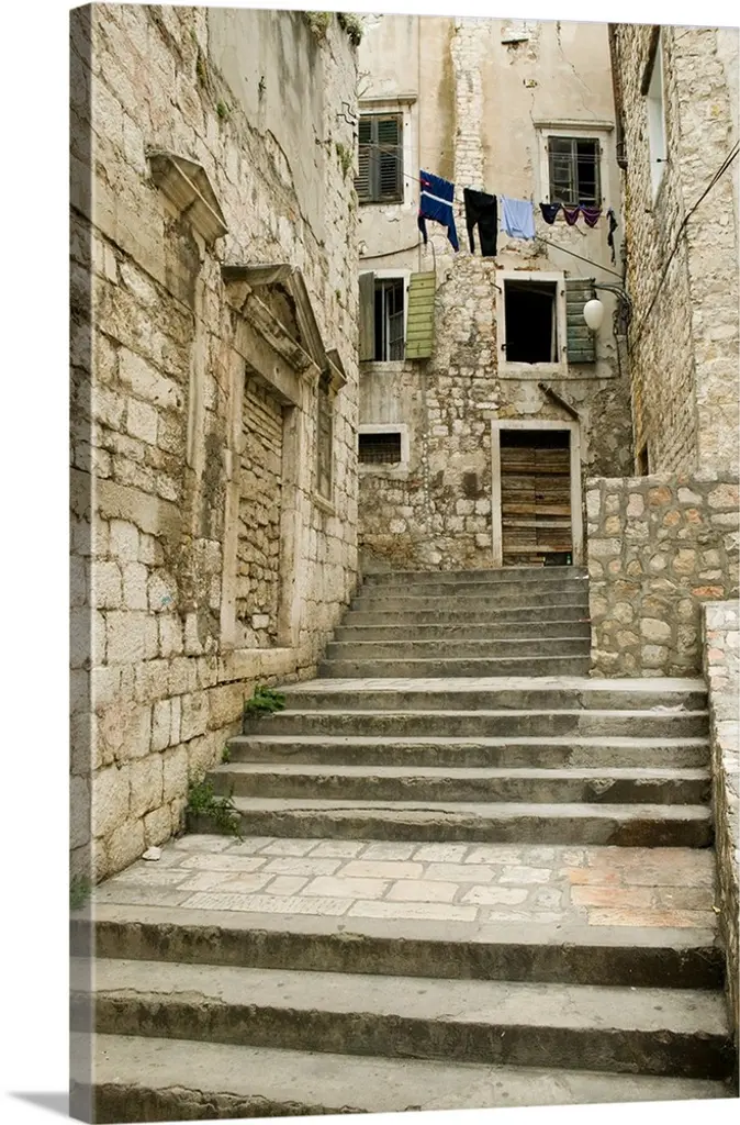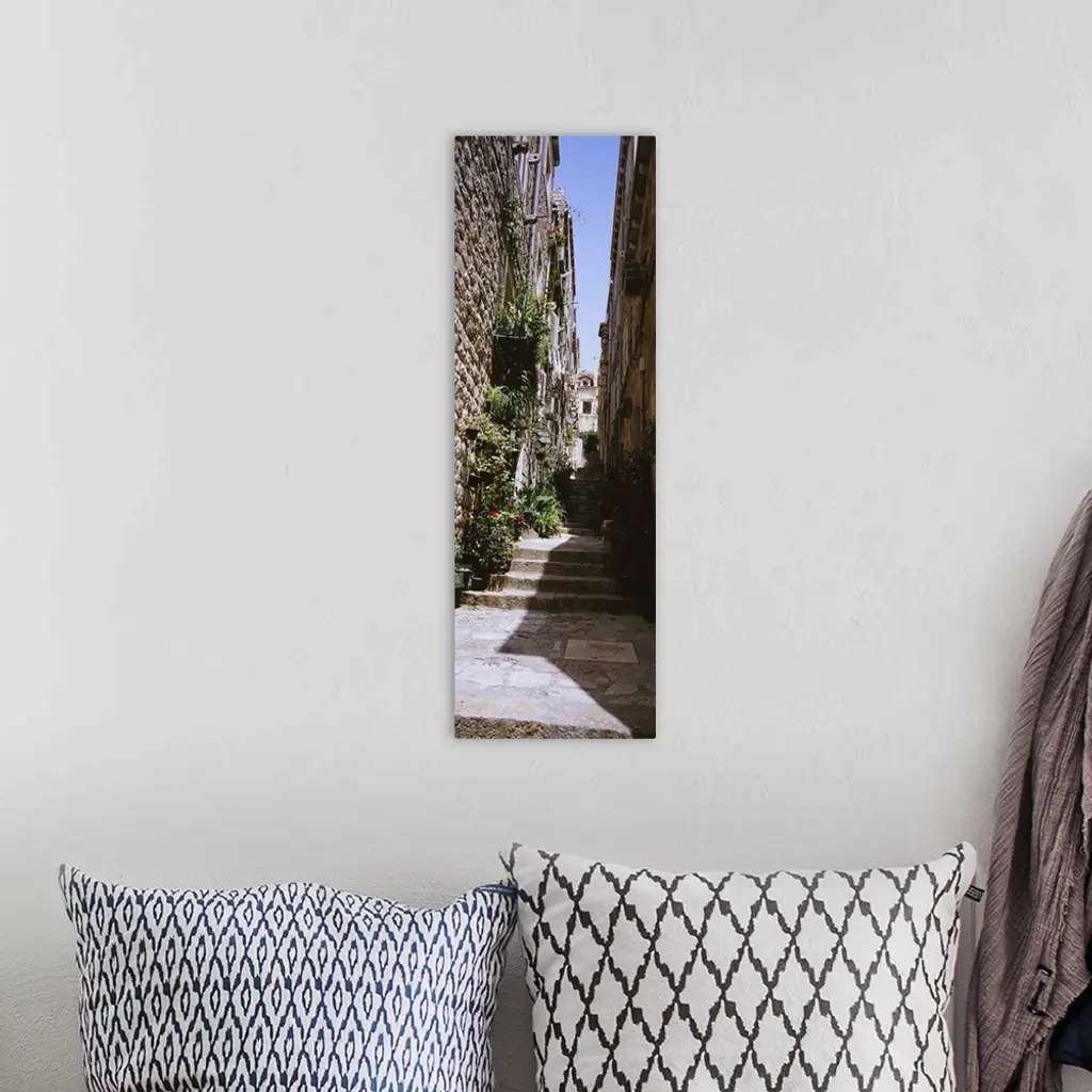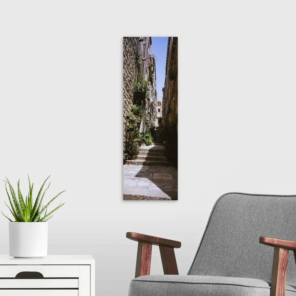 Low angle view of steps in an alley, Dubrovnik, Croatia wall art for home and office decor. Discover canvas art prints, photos, mural, big canvas art and framed wall art in GreatBigCanvas.com's varied collections.