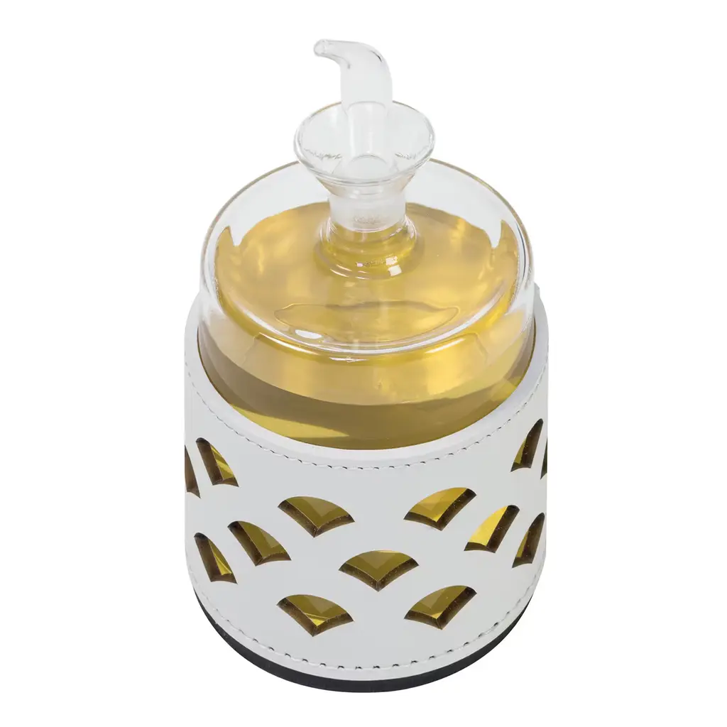 A simple yet original object for the table, the matching cruet is made of transparent borosilicate glass and partially dressed in Finest Regenerated Leather with the special Venezia design. With the decorated cover removable to assure easy cleaning, the Tecnocuoio features a UV-resistant and water-resistant finish and there is also a non-slip waterproof rubber base.