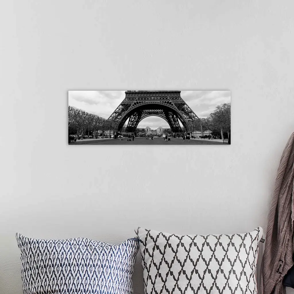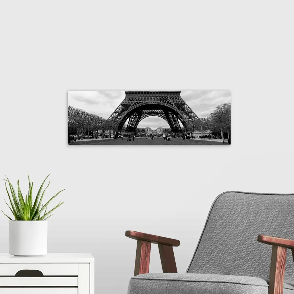 This decorative wall art is a panoramic photograph of the base of the tower and the park that surrounds it.