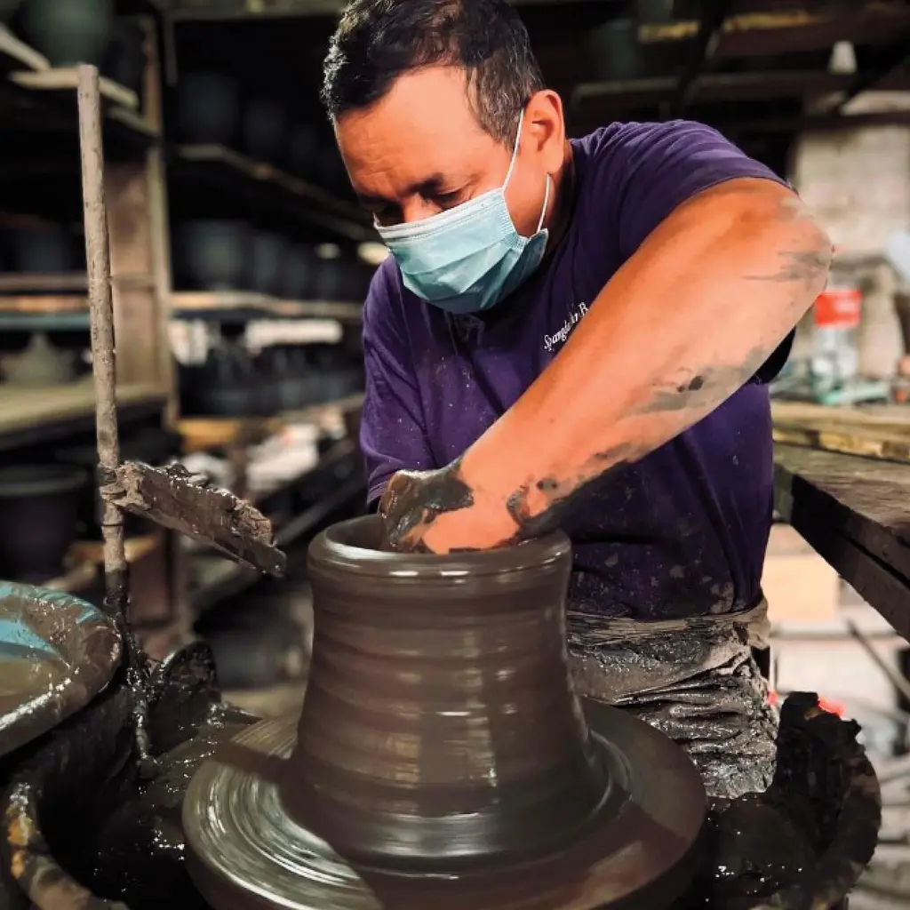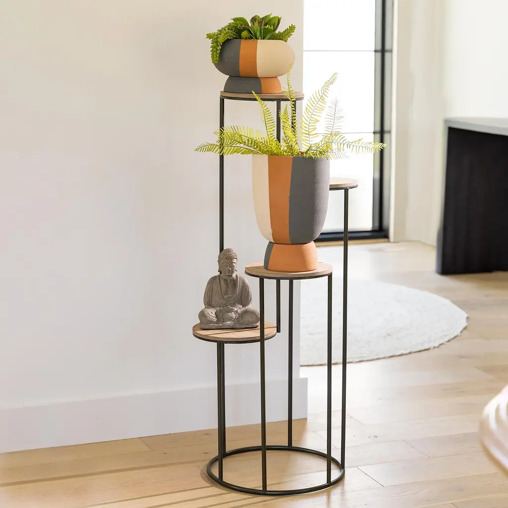 Painted by hand, this Clay Striped Round Planter is perfectly sized to accommodate a variety of plants, succulents, and cacti. A mixture of the natural terracotta and the painted clay make for a modern look. The low round planter sits atop a terracotta base providing a unique design element. Use with the base or set alone for a low profile.