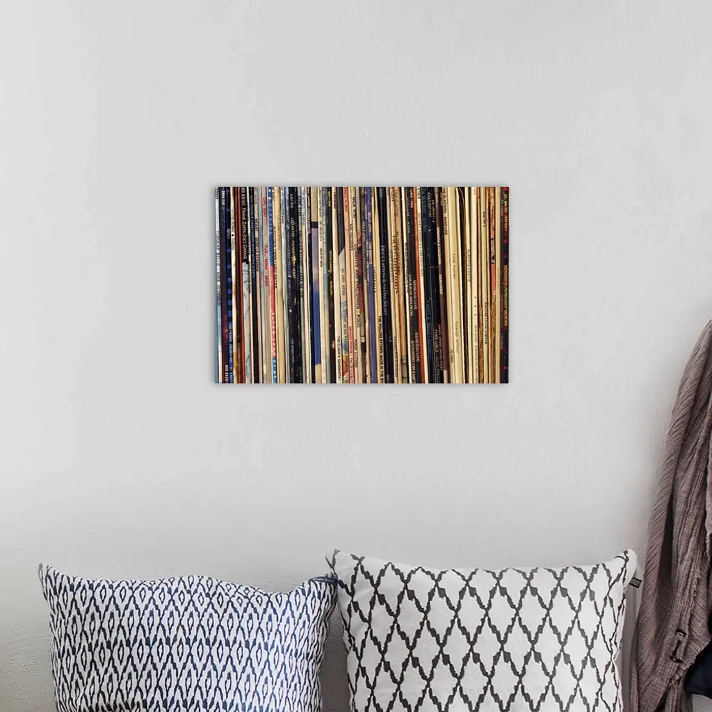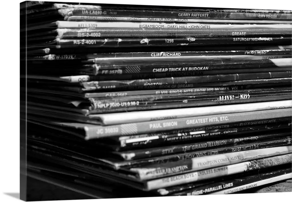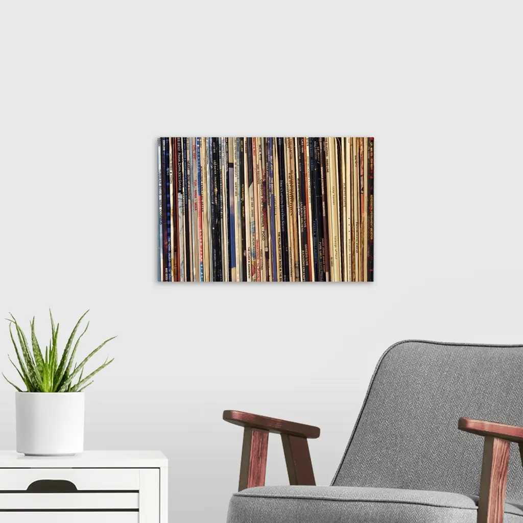 Horizontal, close up photograph of a row of tightly packed records in their sleeves.