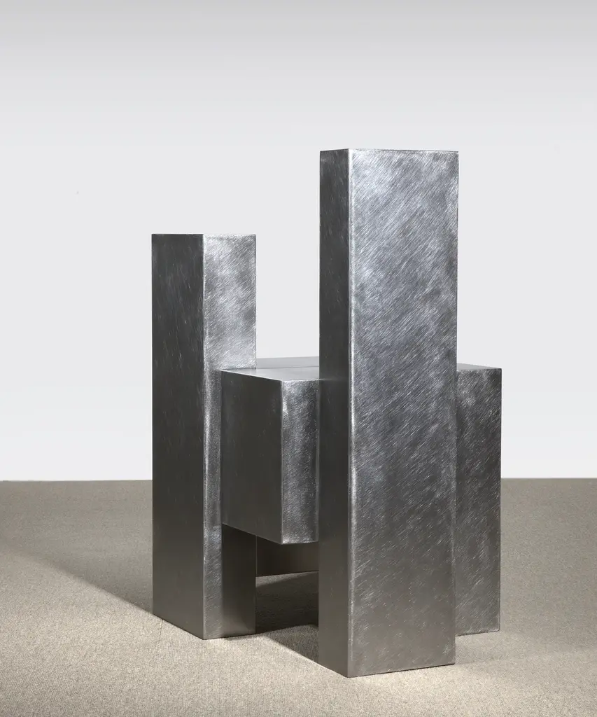 The layered series is the work of stacking materials to make them a basic unit and developing various forms and functions by combining them. Layered steel is as part of the Layered series, the stainless steel surface is 100% hand-sanded and wax finished to add depth and emphasize formability.The Layered Series is the main concept of Hwang's work. He focuses on experimentation layering materials we can easily find around us to form architectural compositions. This series starts from his childhood memory of an incessantly transforming city full of geometric architecture. Designed by Hyungshin Hwang in Seoul, South Korea.