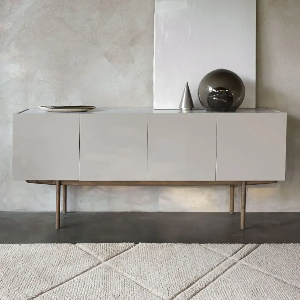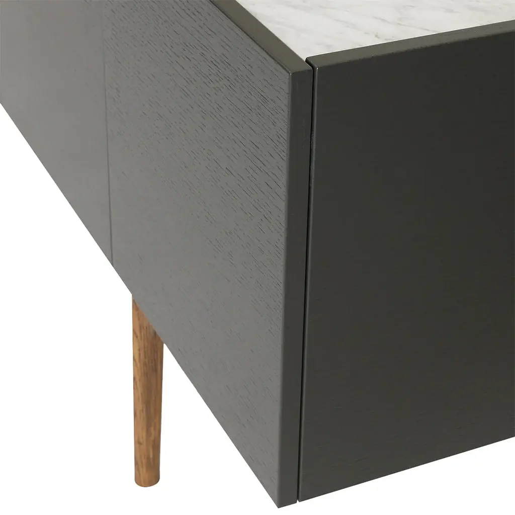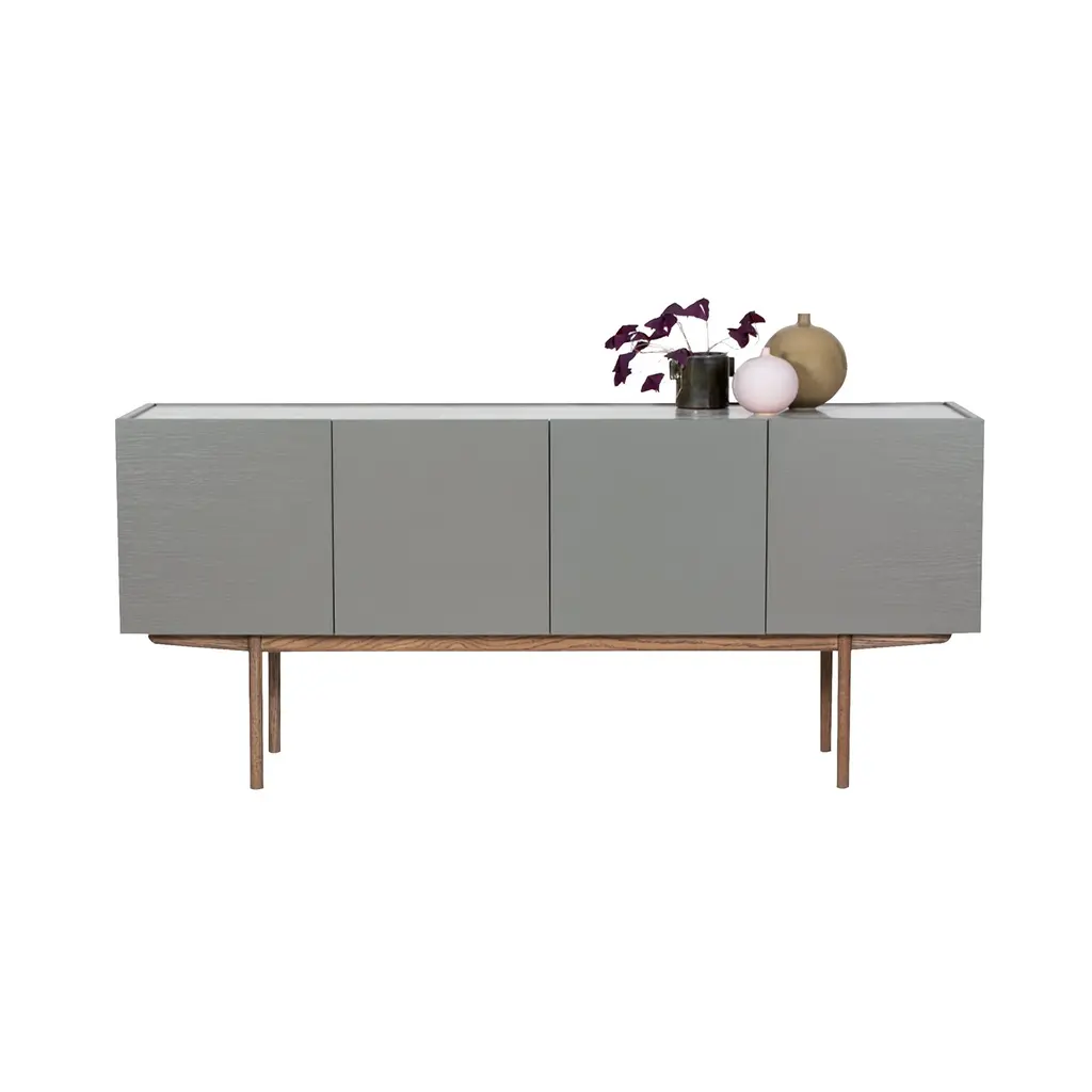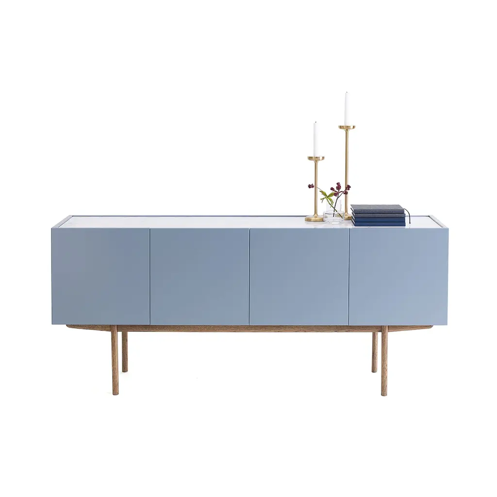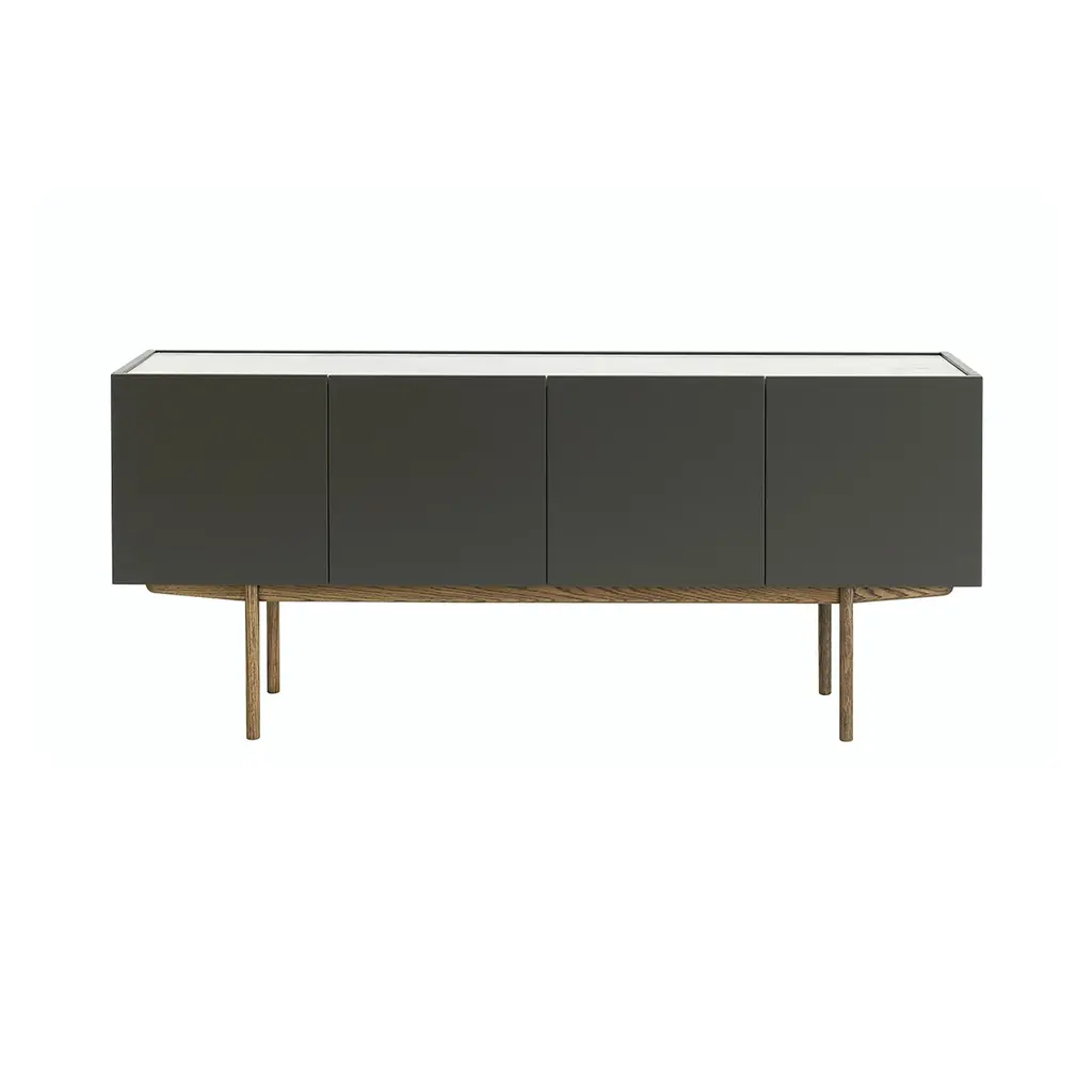 Designers Broberg & Ridderstråle bring a keen balance to the mix of elements in their Luc Deluxe 160. The impressively scaled 4-door sideboard features a lacquered oak cabinet in a range of subtle hues, set on a woodgrain stand in one of a number of stained oak finishes. For a final flourish, the top surface can then be selected in either solid stone—Belgian limestone, Carrara marble or Nuvolato Marble—or transparent float glass.