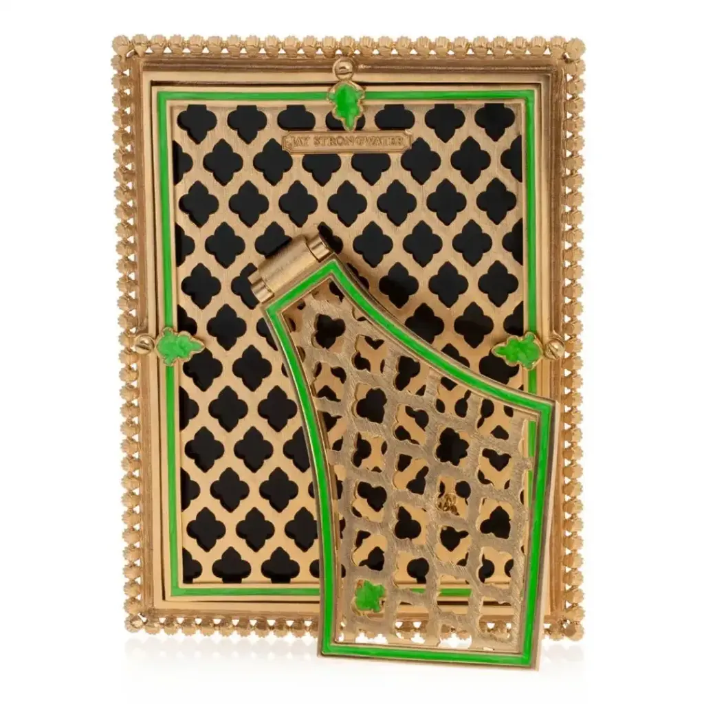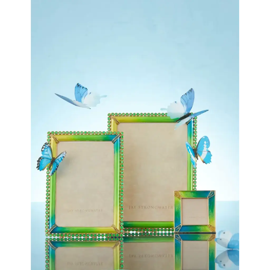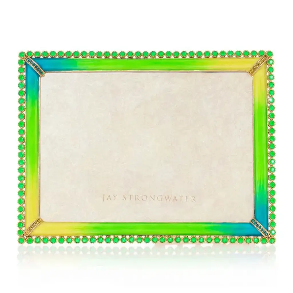 Frame your loved ones with a pop of electric green enamel and jewels! We created a special edition of our classic Lucas 5” x 7” frame in a vivid ombre of chrome yellow to lime green enamel bordered in a limited edition of Swarovski electric green crystals. Hand-painted enamels with hand-set crystals on a 14K gold finished metal frame created at the Jay Strongwater Rhode Island workshop. With our signature, fleur-de-lis metal back plate and kickstand – this frame is truly beautiful from any view. Stands vertically or horizontal.