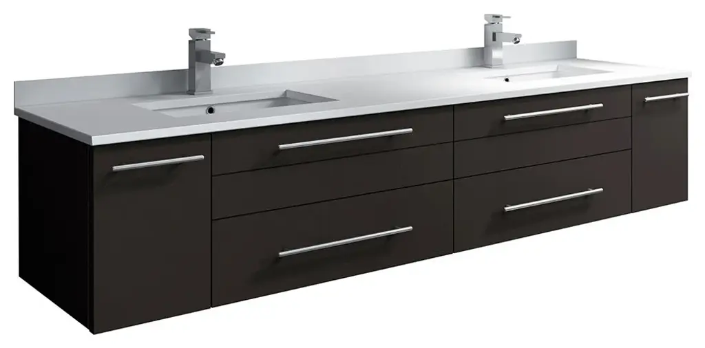 Expand your bathroom's functionality with the Fresca Lucera 72" wall mount vanity, designed to provide more counter space and ample storage. This modern wall mount vanity features two spacious lower drawers and additional side cabinets, perfect for storing towels, taller toiletry bottles, and other essentials. The extra countertop space allows you to spread out and get ready with ease, while the sleek, contemporary design creates an uncluttered, minimalist look that enhances any bathroom. Features two soft-close drawers for optimal storage. Included Components: Covered under Fresca's 3 year limited warranty and no commercial warranty Engineered wood and wood vanity cabinet with 2 doors and 2 drawers Quartz vanity top with two ceramic sinks Faucet is not included and must be purchased separately Cabinet Features: Constructed from engineered wood and wood providing a lifetime of durability Wall mounted installation - vanity attaches to the wall creating a floating appearance for a modern look Double door design provides easy access to storage space 2 full extension drawers with soft-close slides allow for organized storage Soft close drawer slides operate on smooth ball-bearings and prevent drawers from slamming shut Vanity cabinet includes matching decorative hardware Vanity will need to be assembled Dimensions of vanity: 72"W x 20-3/8"D x 15-7/8"H Wall mount vanity design offers a floating, streamlined appearance and easy cleaning underneath Includes two undermount sinks and a countertop, pre-drilled for your choice of faucet (faucet sold separately) Crafted from solid and engineered wood, available in multiple finishes to match your style Features two soft-close drawers and two cabinets for ample storage Oversized hardware and beveled front detail add a modern, striking touch Bring a fresh, modern look to your bathroom with the Fresca Lucera floating bathroom vanity, blending style, space, and functionality Vanity Top Features: Quartz vanity top includes sinks Single pre-drilled faucet hole per basin Each sink features its own rectangular single basin workspace Center drain location provides optimal draining capability Equipped with an overflow drain to help prevent spillage Cabinet Specifications: Cabinet Width: 71-3/16" (left to right) Cabinet Height: 15" (top to bottom) Cabinet Depth: 20" (front to back) Number of Doors: 2 Number of Drawers: 2 Vanity Top Specifications: Vanity Top Width: 72" (left edge to right edge) Vanity Top Depth: 20-3/8" (front edge to back edge) Number of Basins: 2 Sink Dimensions: 8"H x 14"W x 19"L Sink Cutout Length: 15-3/4" (left to right) Sink Cutout Width: 10-13/16" (front to back) Sink Basin Dimensions: 16" L x 11" W x 6-3/4" D Number of Faucet Holes: 1 Faucet Centers: 0" (distance between the installation holes for the faucet handles)