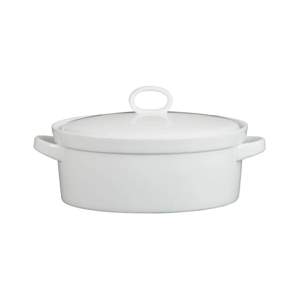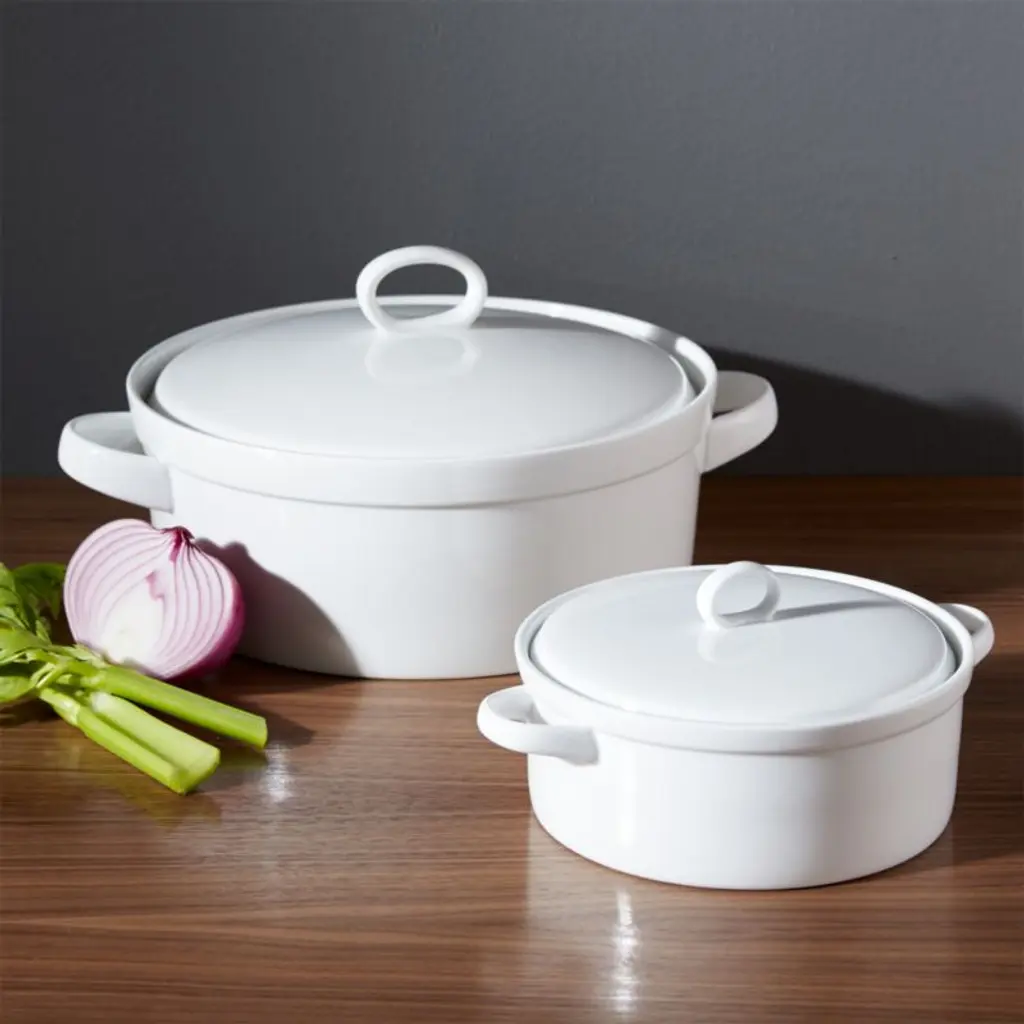 All-purpose lidded casserole in durable white porcelain goes from oven to table in style. Use our three-quart baking dish to cook and serve chicken pot pie, mushroom casserole and banana bread pudding. Looped handles on the dish and lid add playful detail and make carrying and serving safe and easy. The sturdy yet graceful dish is safe to use in the oven, freezer, microwave and dishwasher, making prep, cooking, storage and cleanup a breeze.