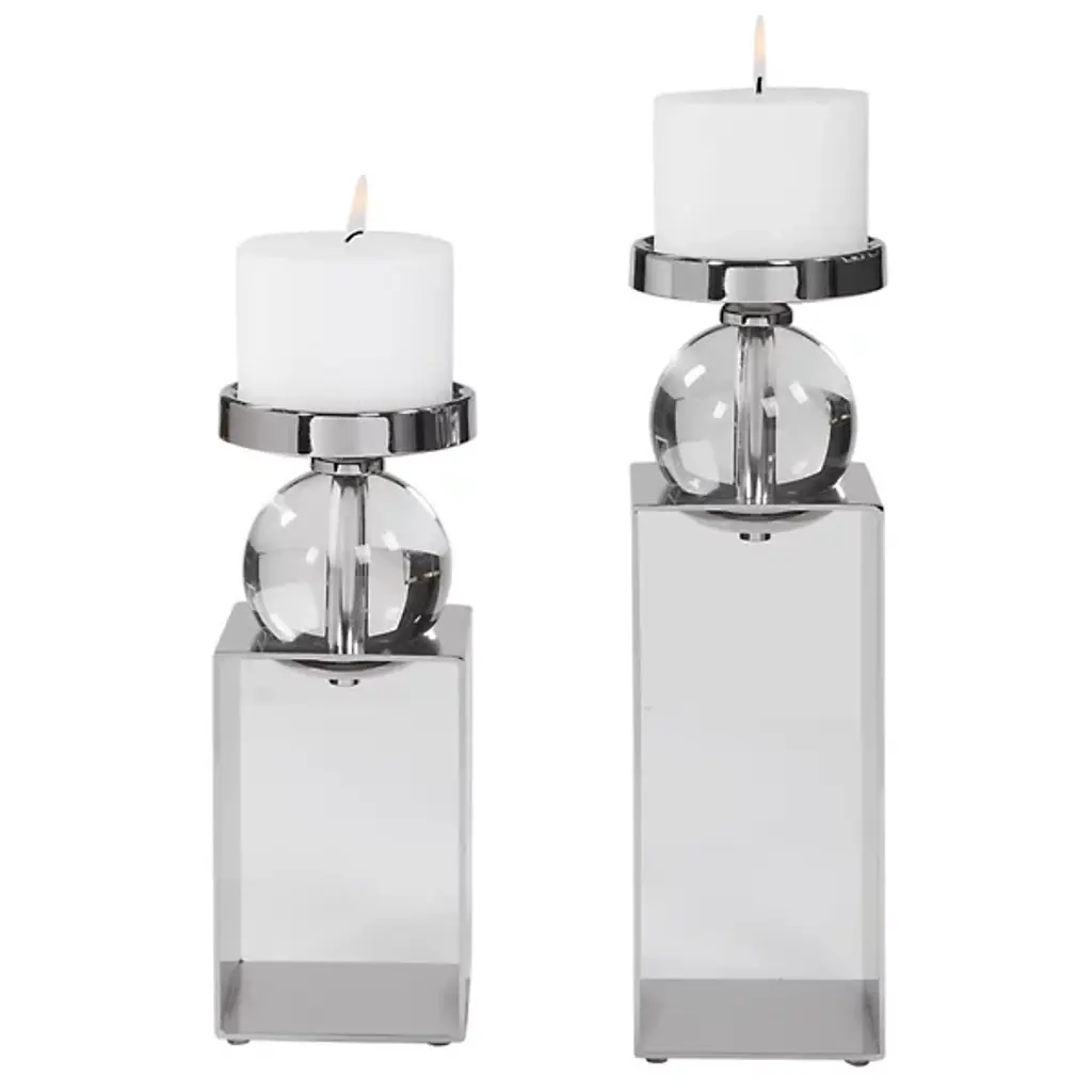 The Lucian Candleholders, Set of 2 Set from Uttermost employs architectural principles of negative space to create drama around the flame. The geometric bases establish a solid foundation while the crystal spheres appear to float between the metal components, refracting light in unexpected directions. The open framework design allows candle glow to interact with surrounding surfaces rather than simply illuminating upward. Each holder comes complete with a distressed pillar candle that contrasts with the pristine polish of the metal and crystal elements. These pieces bring formal dining table ambiance to everyday spaces.