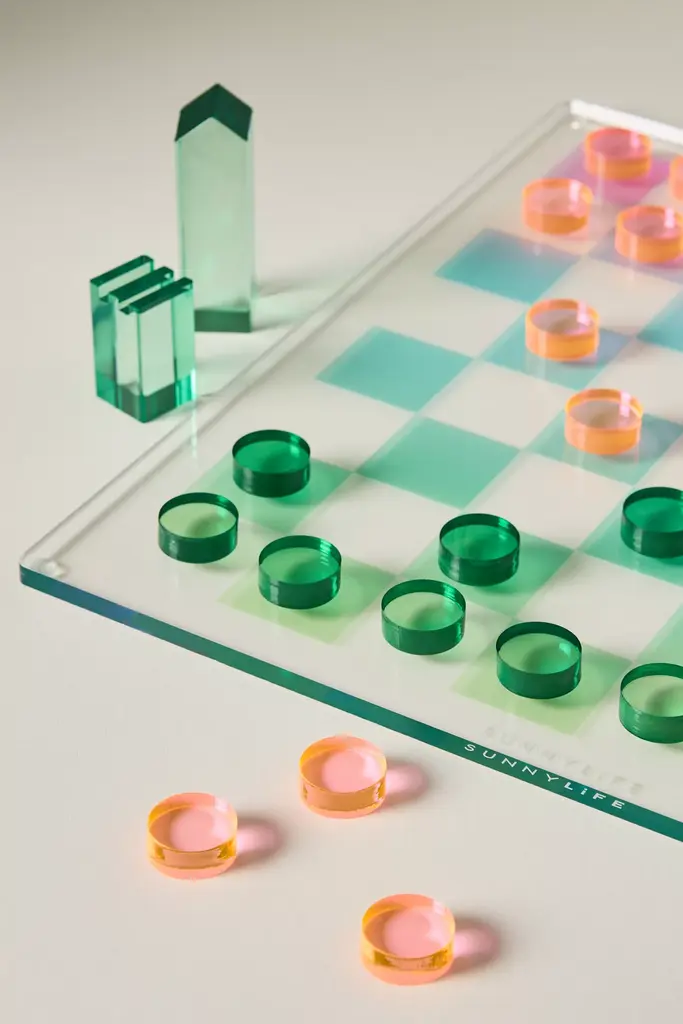 Add a sophisticated pop of color to game night with this wild new take on two iconic board games. This eye-catching transparent lucite chess and checkers set is a must-have for any lover of retro style and kaleidoscopic hues, designed to be just as beautiful out on display as during a game.