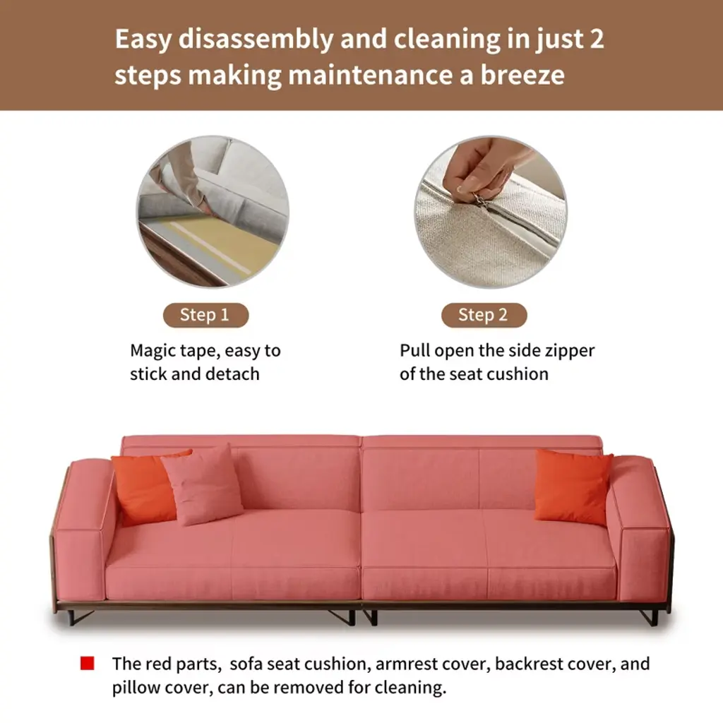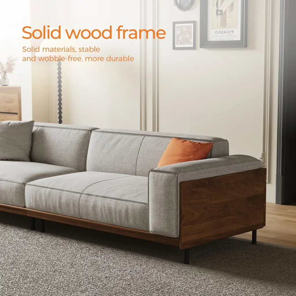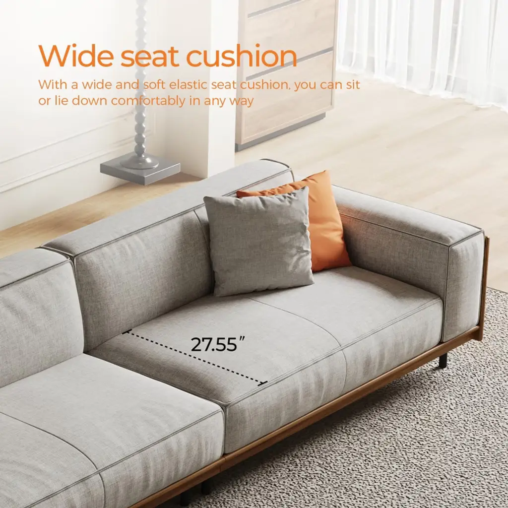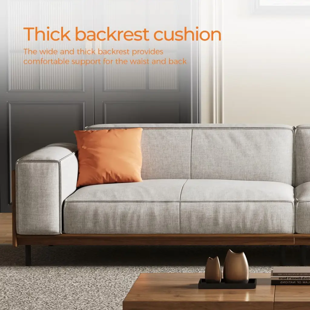 This set of outdoor sofas combines quality and comfort. The cotton and sofa linen fabric is breathable and refreshing, sofa exuding a rustic charm and easily adapting to various outdoor scenes. The spring seat cushions are highly elastic and provide strong support. The cushions of the backrests and armrests filled with soft sponges are fluffy and elastic,Sofa bringing a pleasant leaning experience. The solid wood frame is sturdy and durable, sofa and its natural texture complements the cotton and sofa linen fabric. The sofa overall style is harmonious and unified, being both practical and aesthetically pleasing, adding a warm and unique scenery to the outdoor space. Features Covered with breathable cotton-linen fabric, stays cool during long use High-density sponge-filled backrest cushion brings ultimate comfort Solid wood frame structure ensures strong load - bearing capacity High-density spring - supported seat cushions: sit for long without fatigue Appropriate sitting height, thicker cushion, for comfortable sitting experience Sturdy metal legs for higher load bearing capacity, foot pads for floor protection It can be placed in the living room, outdoors, the bedroom and the study Illustrated tutorials included, assemble furniture effortlessly Specifications: Color: Gray+Wood grain color Material: Cotton linen fabric, Pine wood, Plywood, Sponge, Spring, Metal Overall dimension: 111.81'' x 36.61'' x 31.49'' (L x W x H) Backrest dimension: 92.9'' x 15.74'' (W x H) Seat dimension: 92.9'' x 27.55'' (W x D) Seat height from the ground: 16.53'' Armrest height: 25.98'' Weight capacity: 900 lbs Net weight: 253.5 lbs Package includes: 1 X Sofa 1 x User's Manual