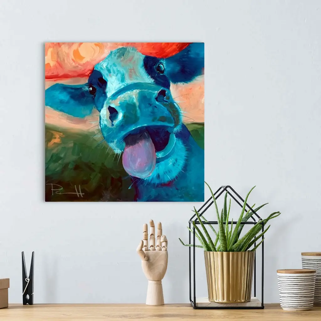 Portrait of a blue cow sticking out its tongue.