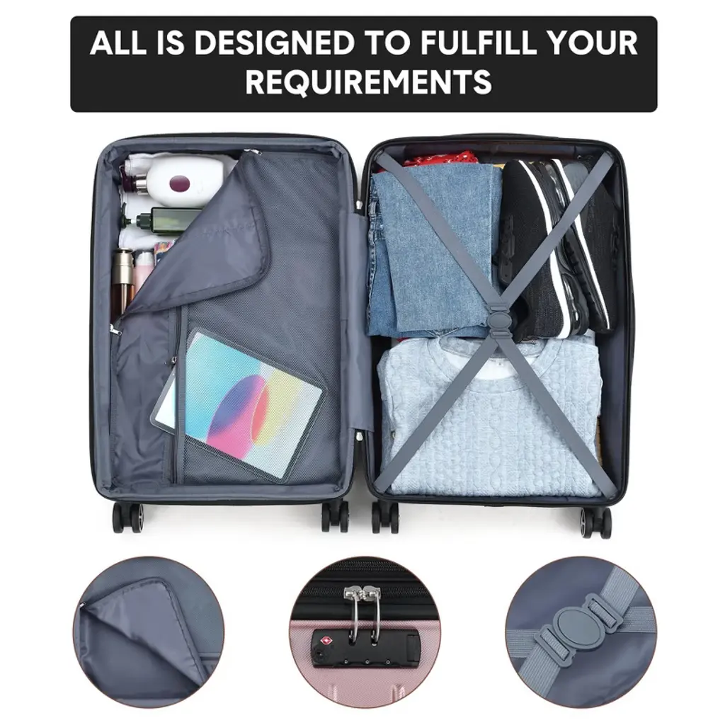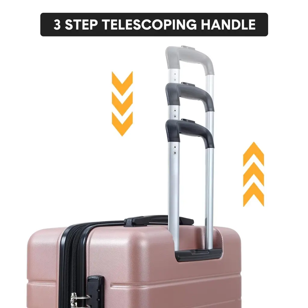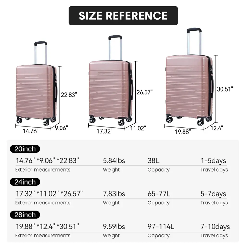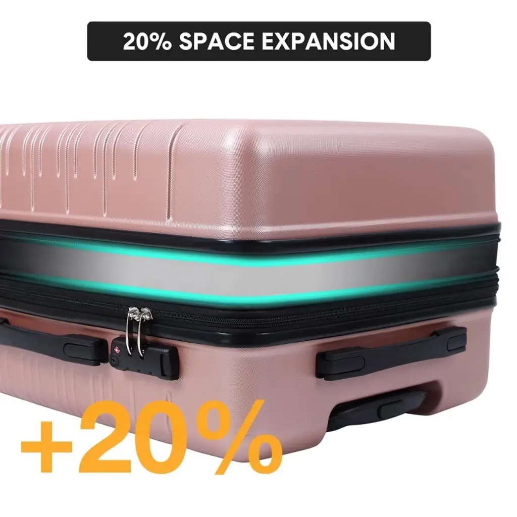 Hardshell Luggage Set, 3-Piece Expandable Suitcase Set with Spinner WheelsProduct Description:Elevate your travel experience with this complete 3-piece hardshell luggage collection, designed to adapt to every journey. Crafted from durable, scratch-resistant ABS material, this versatile set includes a 20¡± carry-on for short trips, a 24¡± medium suitcase for extended weekends, and a spacious 28¡± luggage for longer vacations. The 24¡± and 28¡± suitcases feature an innovative expandable design, offering 20% additional packing space when needed. With smooth-gliding 360¡ã spinner wheels, TSA-approved security locks, and thoughtfully organized interiors, this collection combines functionality and style for business trips, family vacations, and global adventures.Key Features:? Complete 3-Piece Travel System: Includes 20¡± carry-on (overhead compliant), 24¡± medium, and 28¡± large suitcases¡ªperfect for everything from business trips to extended vacations.? Smart Expandable Design: The 24¡± and 28¡± suitcases easily expand by 20%, providing flexible storage for souvenirs or extra belongings without compromising maneuverability.? Smooth 360¡ã Mobility: Quad silent spinner wheels ensure effortless navigation across carpets, pavements, and uneven surfaces, offering stability and ease in crowded airports.? Enhanced TSA Travel Security: Each suitcase features TSA-approved dual locks to secure main and laptop compartments, enabling hassle-free security checks while protecting valuables.? Organized Interior Layout: Designed with compression straps, a waterproof toiletry pouch, and a U-shaped zippered compartment for privacy, keeping contents secure and neatly arranged.Specifications:? 20¡± Dimensions: 22.24¡± x 14.57¡± x 8.86¡±? 24¡± Dimensions: 26.18¡± x 17.13¡± x 10.83¡±? 28¡± Dimensions: 30.12¡± x 19.49¡± x 12.01¡±? Material: Scratch-Resistant ABS Hard Shell? Features: 3-Stage Telescopic Handle, 360¡ã Spinner Wheels, TSA-Approved Locks? Expandable: 24¡± and 28¡± suitcases expand by 20%