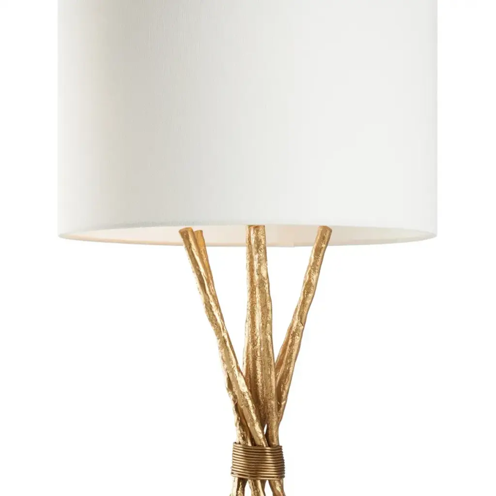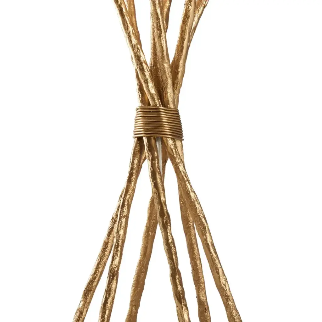 This gold lamp features a sculptural base resembling slender sticks elegantly bound together by a sleek metallic band, creating a refined and artistic silhouette. Its minimalist design and warm golden finish lend a touch of sophistication and modern charm to any space.