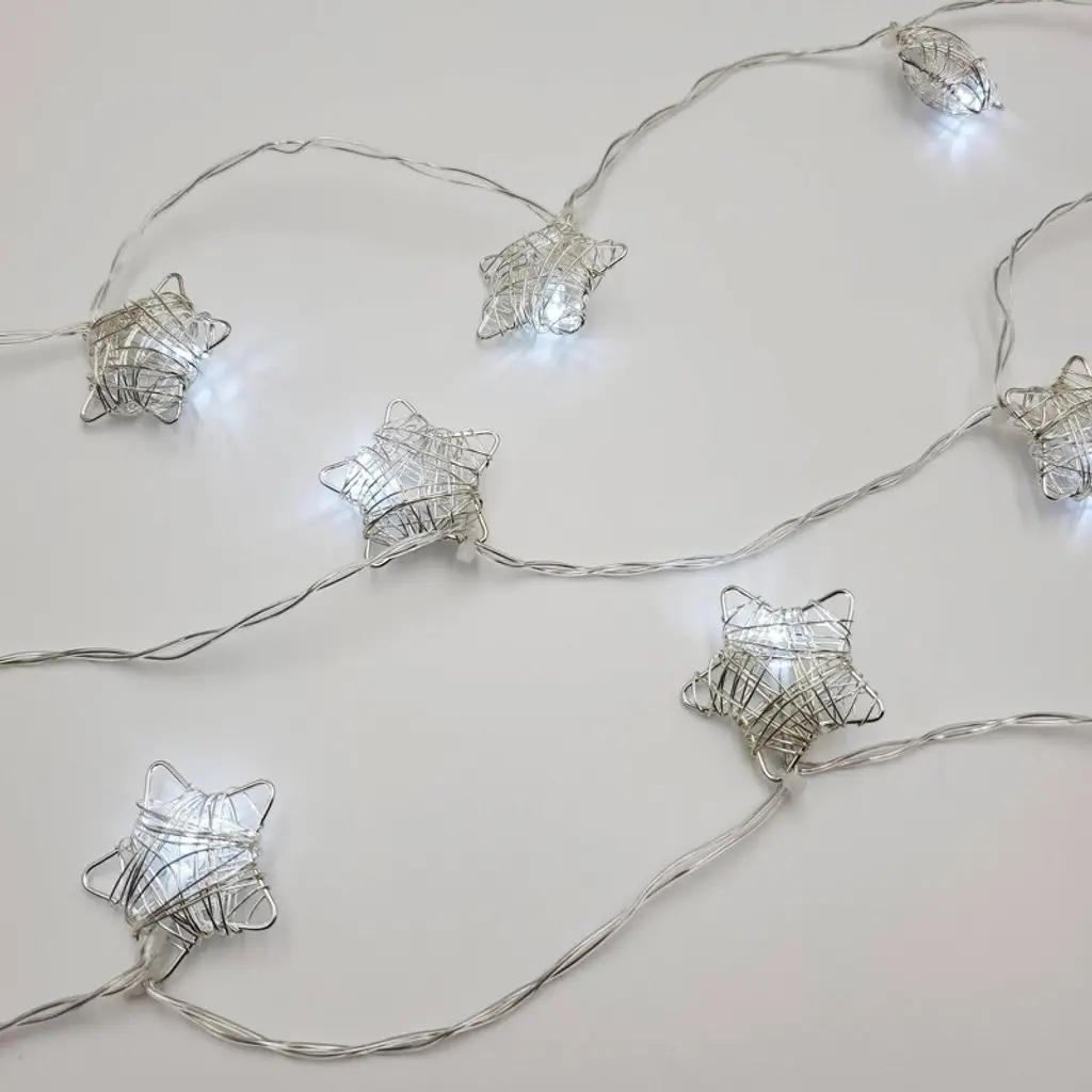 Battery-operated string lights with 20 silver stars from LumaBase are the perfect addition to a special event, holiday, or everyday home décor. Create a stunning display as the cool white LED lights illuminate through the silver, wire-wound metal stars. With the convenience of a 6 hour timer, these battery operated string lights are the perfect source of ambient light for all occasions. Indoor use only. Requires 3 AA batteries (not included).