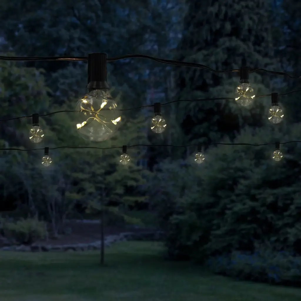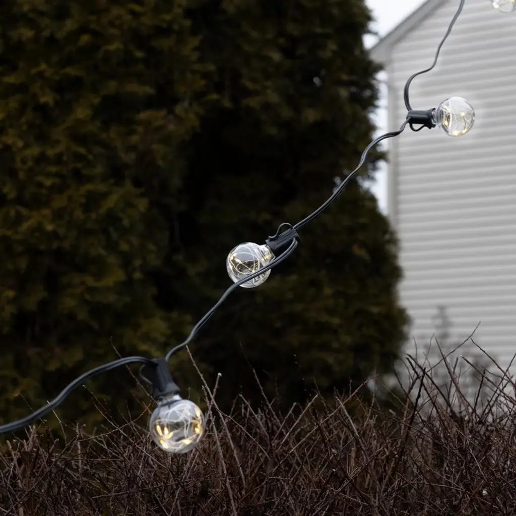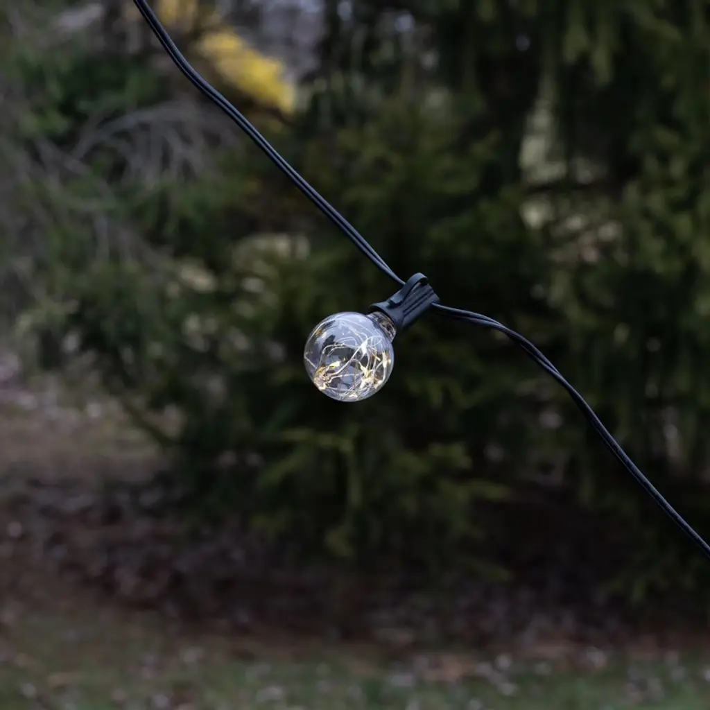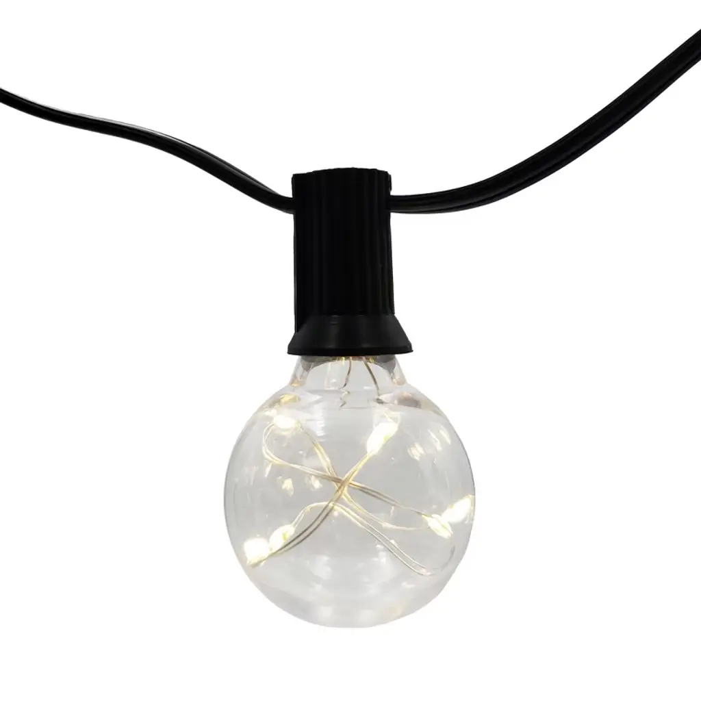 The electric globe style bulb string light with enclosed LED fairy lights creates a trendy atmosphere to your indoor or outdoor décor. Each globe style bulb is filled with warm white LED fairy lights with a silver wire. Globe string lights are the perfect accent lighting to a patio, deck, porch, indoor space, or party tent.