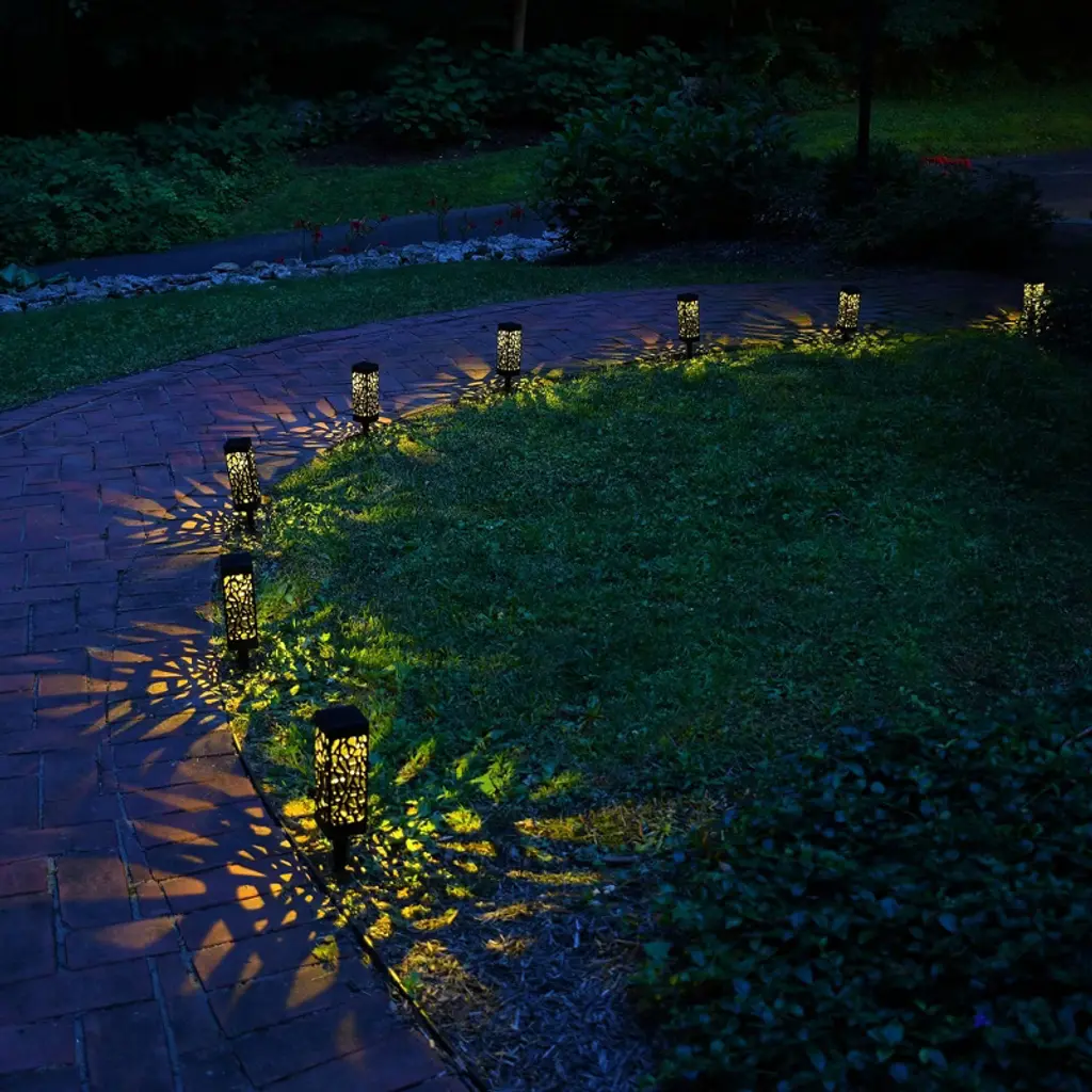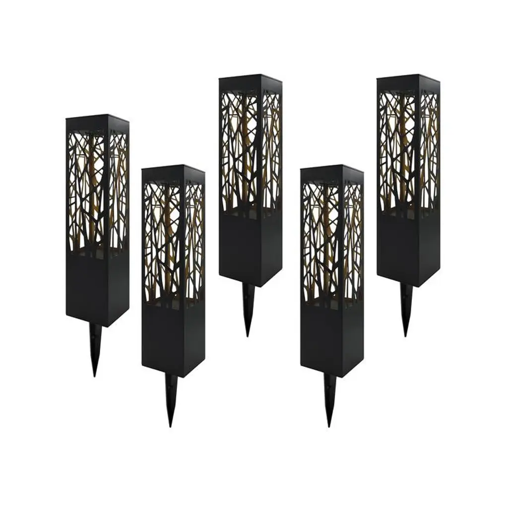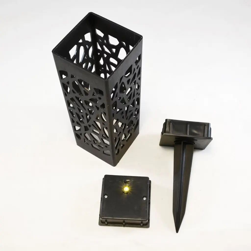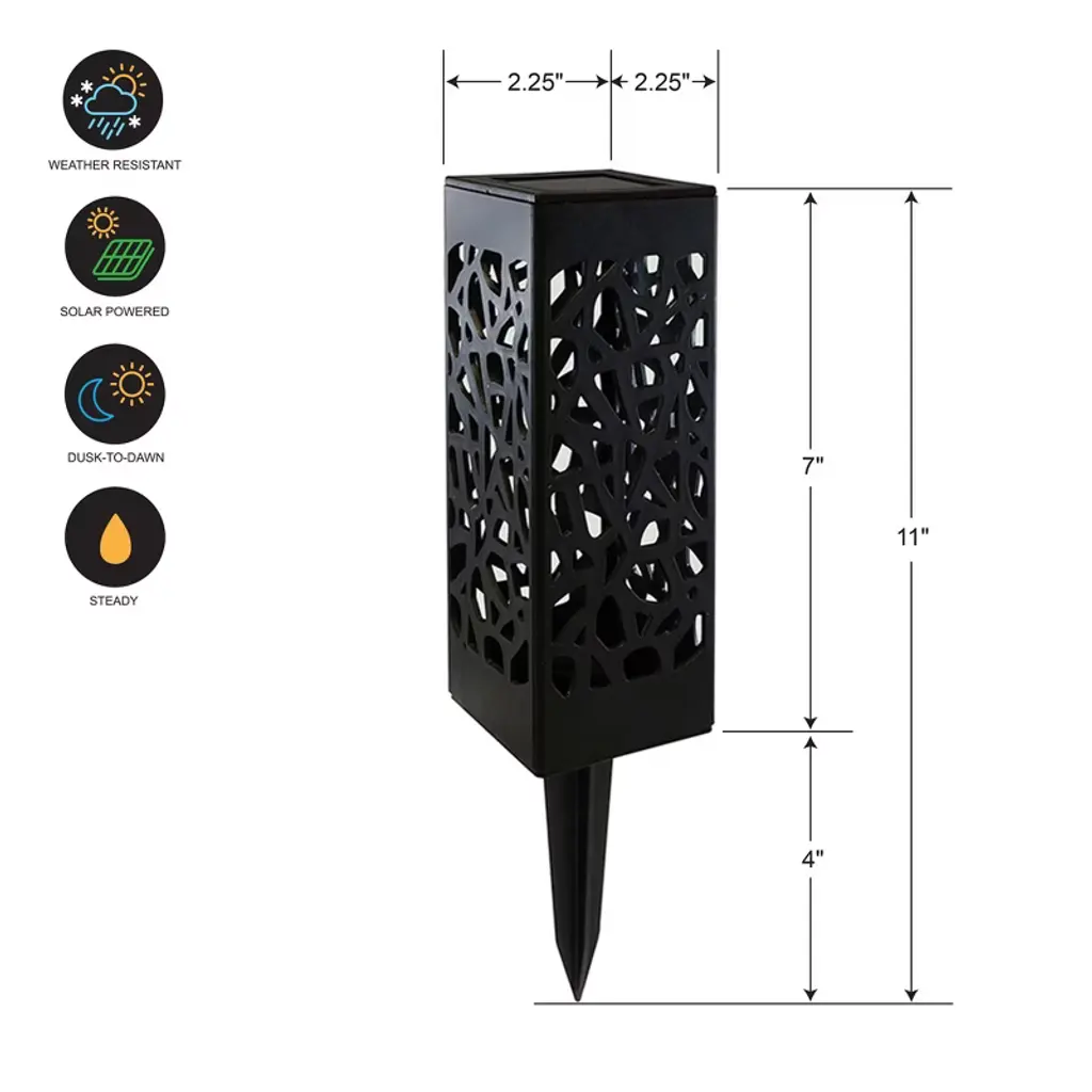 Display this set of four black solar-powered lights along your walkway, garden, or patio. Remove the stakes from the sturdy plastic lights to set on your outdoor table for beautiful illumination. Keep the lights in a sunny area every day to charge the panel for nighttime illumination. The amber LED light shines through the fractal design, creating a beautiful and artistic pattern.