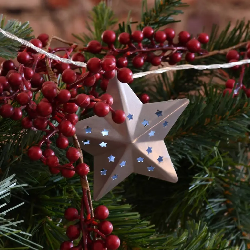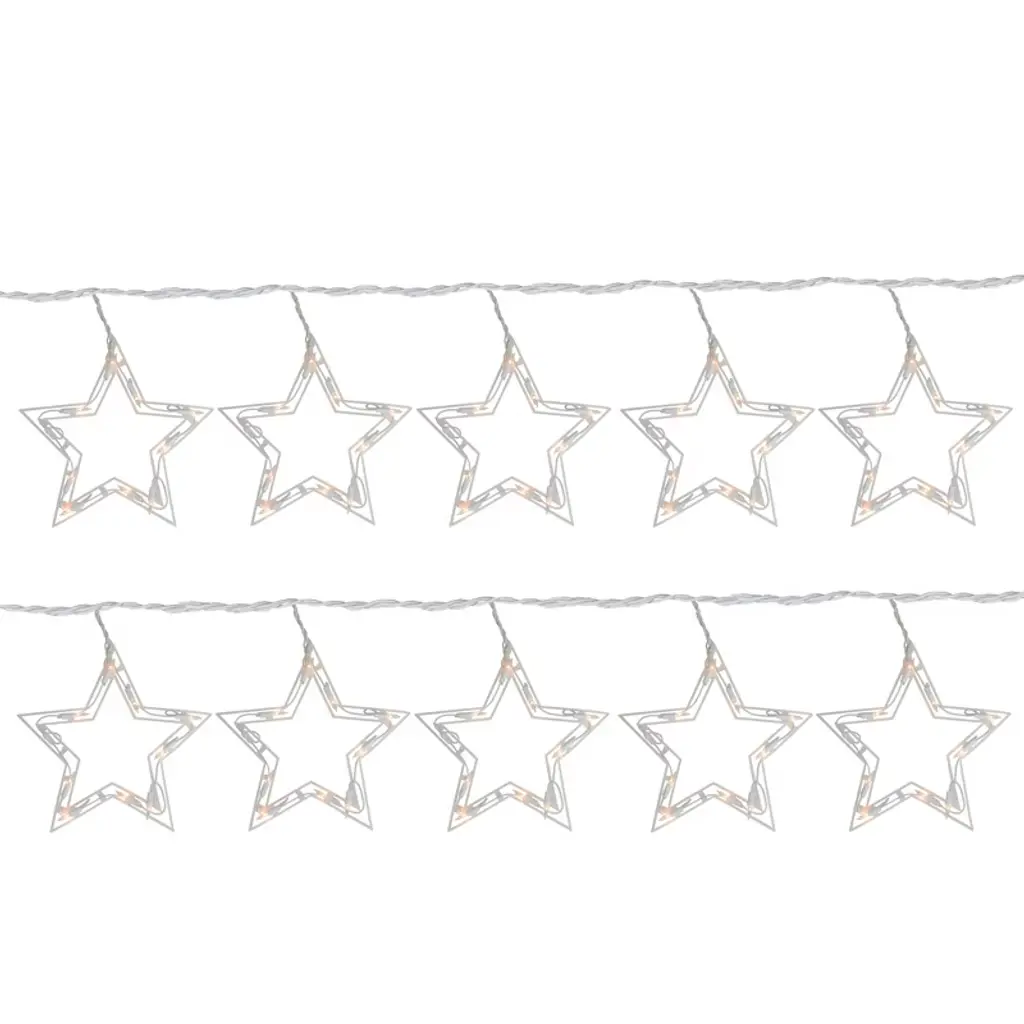 Solar-powered string lights with silver metal stars from LumaBase add a festive touch to your outdoor décor. The cool white LED lights shine through the stars' design opening, creating an eye-catching glow. Their lovely illumination adds perfect accent lighting to a patio, porch, deck, garden, tree, or entryway. Charged by the sun, these string lights can be placed anywhere outdoors with no extension cord needed. These lights will highlight your outdoor décor from dusk until dawn.